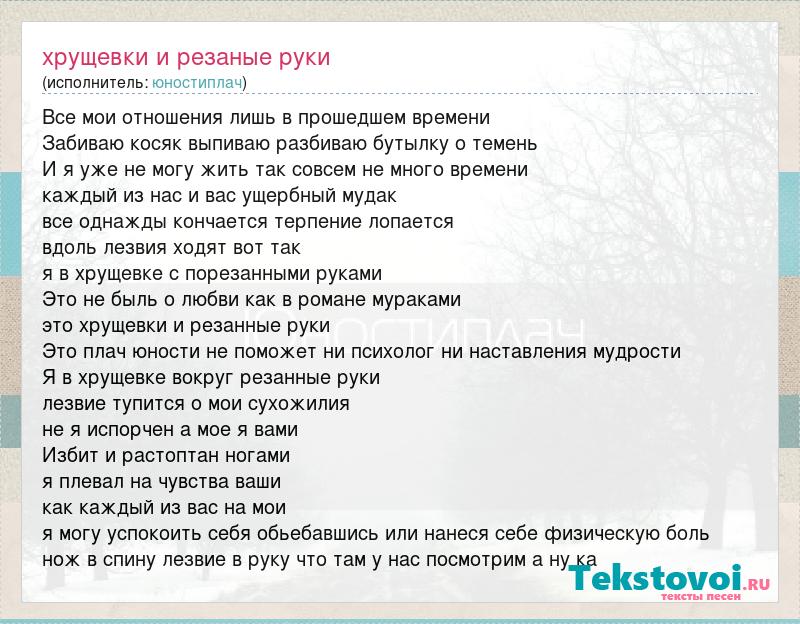 Все мои отношения лишь в прошедшем времени Забиваю косяк выпиваю разбиваю бутылку о темень И я уже не могу жить так совсем не много времени каждый из нас и вас ущербный мудак все однажды кончается терпение лопается вдоль лезвия ходят вот так я в хрущевке с порезанными руками Это не быль о любви как в романе мураками это хрущевки и резанные руки Это плач юности не поможет ни психолог ни наставления мудрости Я в хрущевке вокруг резанные руки лезвие тупится о мои сухожилия не я испорчен а мое я вами Избит и растоптан ногами я плевал на чувства ваши как каждый из вас на мои я могу успокоить себя обьебавшись или нанеся себе физическую боль нож в спину лезвие в руку что там у нас посмотрим а ну ка