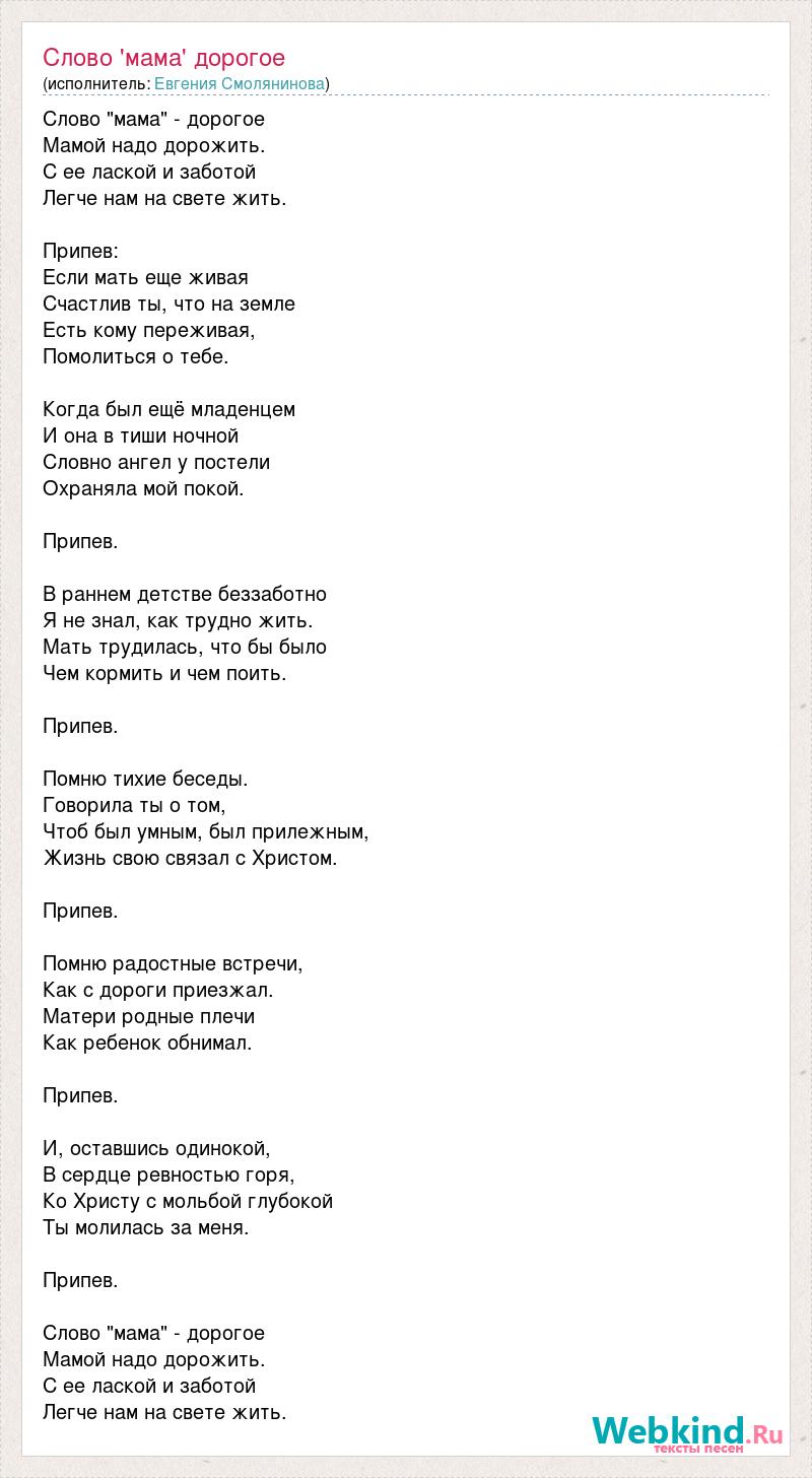 Слово "мама" - дорогое Мамой надо дорожить. С ее лаской и заботой Легче нам на свете жить. Припев: Если мать еще живая Счастлив ты, что на земле Есть кому переживая, Помолиться о тебе. Когда был ещё младенцем И она в тиши ночной Словно ангел у постели Охраняла мой покой. Припев. В раннем детстве беззаботно Я не знал, как трудно жить. Мать трудилась, что бы было Чем кормить и чем поить. Припев. Помню тихие беседы. Говорила ты о том, Чтоб был умным, был прилежным, Жизнь свою связал с Христом. Припев. Помню радостные встречи, Как с дороги приезжал. Матери родные плечи Как ребенок обнимал. Припев. И, оставшись одинокой, В сердце ревностью горя, Ко Христу с мольбой глубокой Ты молилась за меня. Припев. Слово "мама" - дорогое Мамой надо дорожить. С ее лаской и заботой Легче нам на свете жить.
