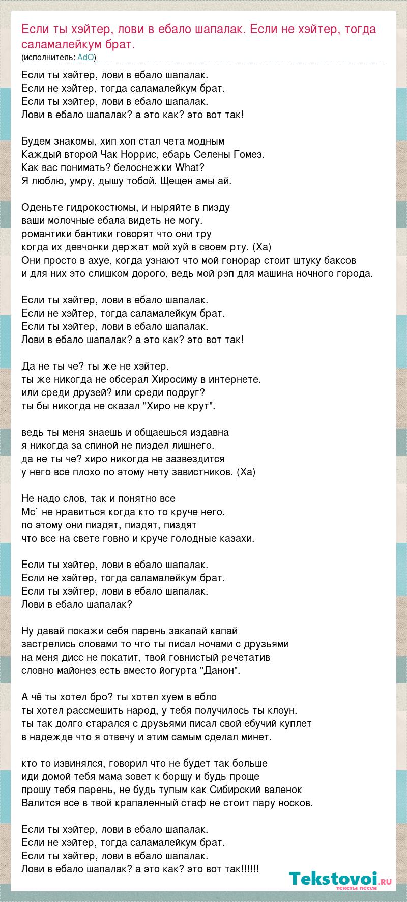 Если ты хэйтер, лови в ебало шапалак. Если не хэйтер, тогда саламалейкум брат. Если ты хэйтер, лови в ебало шапалак. Лови в ебало шапалак? а это как? это вот так! Будем знакомы, хип хоп стал чета модным Каждый второй Чак Норрис, ебарь Селены Гомез. Как вас понимать? белоснежки What? Я люблю, умру, дышу тобой. Щещен амы ай. Оденьте гидрокостюмы, и ныряйте в пизду ваши молочные ебала видеть не могу. романтики бантики говорят что они тру когда их девчонки держат мой хуй в своем рту. (Ха) Они просто в ахуе, когда узнают что мой гонорар стоит штуку баксов и для них это слишком дорого, ведь мой рэп для машина ночного города. Если ты хэйтер, лови в ебало шапалак. Если не хэйтер, тогда саламалейкум брат. Если ты хэйтер, лови в ебало шапалак. Лови в ебало шапалак? а это как? это вот так! Да не ты че? ты же не хэйтер. ты же никогда не обсерал Хиросиму в интернете. или среди друзей? или среди подруг? ты бы никогда не сказал "Хиро не крут". ведь ты меня знаешь и общаешься издавна я никогда за спиной не пиздел лишнего. да не ты че? хиро никогда не зазвездится у него все плохо по этому нету завистников. (Ха) Не надо слов, так и понятно все Мс` не нравиться когда кто то круче него. по этому они пиздят, пиздят, пиздят что все на свете говно и круче голодные казахи. Если ты хэйтер, лови в ебало шапалак. Если не хэйтер, тогда саламалейкум брат. Если ты хэйтер, лови в ебало шапалак. Лови в ебало шапалак? Ну давай покажи себя парень закапай капай застрелись словами то что ты писал ночами с друзьями на меня дисс не покатит, твой говнистый речетатив словно майонез есть вместо йогурта "Данон". А чё ты хотел бро? ты хотел хуем в ебло ты хотел рассмешить народ, у тебя получилось ты клоун. ты так долго старался с друзьями писал свой ебучий куплет в надежде что я отвечу и этим самым сделал минет. кто то извинялся, говорил что не будет так больше иди домой тебя мама зовет к борщу и будь проще прошу тебя парень, не будь тупым как Сибирский валенок Валится все в твой крапаленный стаф не стоит пару носков. Если ты хэйтер, лови в ебало шапалак. Если не хэйтер, тогда саламалейкум брат. Если ты хэйтер, лови в ебало шапалак. Лови в ебало шапалак? а это как? это вот так!!!!!!
