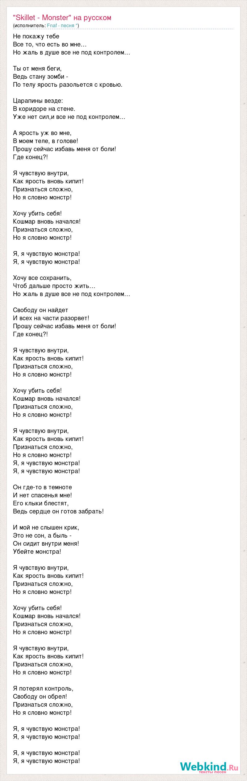 Не покажу тебе Все то, что есть во мне… Но жаль в душе все не под контролем… Ты от меня беги, Ведь стану зомби - По телу ярость разольется с кровью. Царапины везде: В коридоре на стене. Уже нет сил,и все не под контролем… А ярость уж во мне, В моем теле, в голове! Прошу сейчас избавь меня от боли! Где конец?! Я чувствую внутри, Как ярость вновь кипит! Признаться сложно, Но я словно монстр! Хочу убить себя! Кошмар вновь начался! Признаться сложно, Но я словно монстр! Я, я чувствую монстра! Я, я чувствую монстра! Хочу все сохранить, Чтоб дальше просто жить… Но жаль в душе все не под контролем… Свободу он найдет И всех на части разорвет! Прошу сейчас избавь меня от боли! Где конец?! Я чувствую внутри, Как ярость вновь кипит! Признаться сложно, Но я словно монстр! Хочу убить себя! Кошмар вновь начался! Признаться сложно, Но я словно монстр! Я чувствую внутри, Как ярость вновь кипит! Признаться сложно, Но я словно монстр! Я, я чувствую монстра! Я, я чувствую монстра! Он где-то в темноте И нет спасенья мне! Его клыки блестят, Ведь сердце он готов забрать! И мой не слышен крик, Это не сон, а быль - Он сидит внутри меня! Убейте монстра! Я чувствую внутри, Как ярость вновь кипит! Признаться сложно, Но я словно монстр! Хочу убить себя! Кошмар вновь начался! Признаться сложно, Но я словно монстр! Я чувствую внутри, Как ярость вновь кипит! Признаться сложно, Но я словно монстр! Я потерял контроль, Свободу он обрел! Признаться сложно, Но я словно монстр! Я, я чувствую монстра! Я, я чувствую монстра! Я, я чувствую монстра! Я, я чувствую монстра!