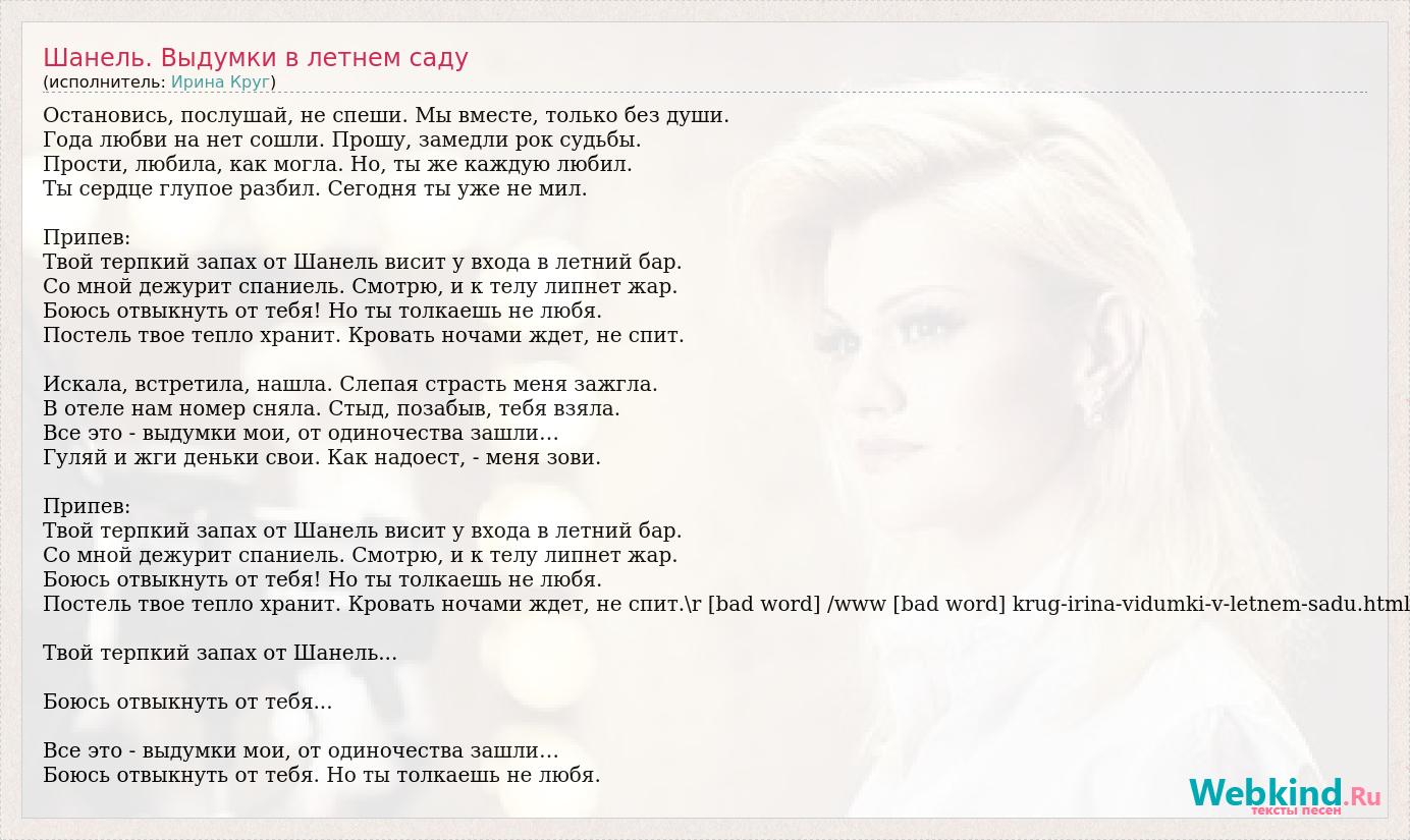 Остановись, послушай, не спеши. Мы вместе, только без души. Года любви на нет сошли. Прошу, замедли рок судьбы. Прости, любила, как могла. Но, ты же каждую любил. Ты сердце глупое разбил. Сегодня ты уже не мил. Припев: Твой терпкий запах от Шанель висит у входа в летний бар. Со мной дежурит спаниель. Смотрю, и к телу липнет жар. Боюсь отвыкнуть от тебя! Но ты толкаешь не любя. Постель твое тепло хранит. Кровать ночами ждет, не спит. Искала, встретила, нашла. Слепая страсть меня зажгла. В отеле нам номер сняла. Стыд, позабыв, тебя взяла. Все это - выдумки мои, от одиночества зашли… Гуляй и жги деньки свои. Как надоест, - меня зови. Припев: Твой терпкий запах от Шанель висит у входа в летний бар. Со мной дежурит спаниель. Смотрю, и к телу липнет жар. Боюсь отвыкнуть от тебя! Но ты толкаешь не любя. Постель твое тепло хранит. Кровать ночами ждет, не спит.\r [bad word] /www [bad word] krug-irina-vidumki-v-letnem-sadu.html Твой терпкий запах от Шанель... Боюсь отвыкнуть от тебя... Все это - выдумки мои, от одиночества зашли… Боюсь отвыкнуть от тебя. Но ты толкаешь не любя.