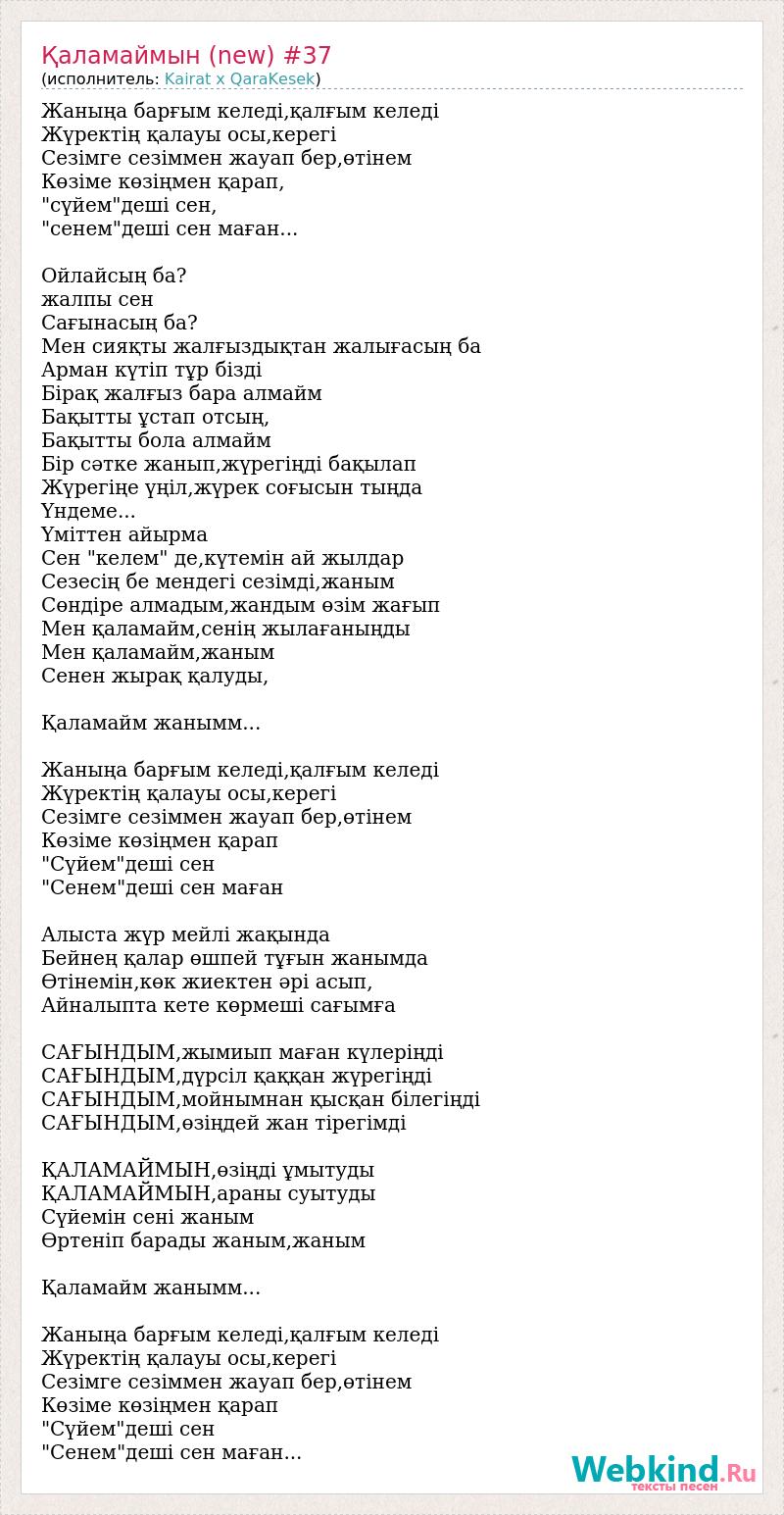 Жаныңа барғым келеді,қалғым келеді Жүректің қалауы осы,керегі Сезімге сезіммен жауап бер,өтінем Көзіме көзіңмен қарап, "сүйем"деші сен, "сенем"деші сен маған... Ойлайсың ба? жалпы сен Сағынасың ба? Мен сияқты жалғыздықтан жалығасың ба Арман күтіп тұр бізді Бірақ жалғыз бара алмайм Бақытты ұстап отсың, Бақытты бола алмайм Бір сəтке жанып,жүрегіңді бақылап Жүрегіңе үңіл,жүрек соғысын тыңда Үндеме... Үміттен айырма Сен "келем" де,күтемін ай жылдар Сезесің бе мендегі сезімді,жаным Сөндіре алмадым,жандым өзім жағып Мен қаламайм,сенің жылағаныңды Мен қаламайм,жаным Сенен жырақ қалуды, Қаламайм жанымм... Жаныңа барғым келеді,қалғым келеді Жүректің қалауы осы,керегі Сезімге сезіммен жауап бер,өтінем Көзіме көзіңмен қарап "Сүйем"деші сен "Сенем"деші сен маған Алыста жүр мейлі жақында Бейнең қалар өшпей тұғын жанымда Өтінемін,көк жиектен əрі асып, Айналыпта кете көрмеші сағымға САҒЫНДЫМ,жымиып маған күлеріңді САҒЫНДЫМ,дүрсіл қаққан жүрегіңді САҒЫНДЫМ,мойнымнан қысқан білегіңді САҒЫНДЫМ,өзіңдей жан тірегімді ҚАЛАМАЙМЫН,өзіңді ұмытуды ҚАЛАМАЙМЫН,араны суытуды Сүйемін сені жаным Өртеніп барады жаным,жаным Қаламайм жанымм... Жаныңа барғым келеді,қалғым келеді Жүректің қалауы осы,керегі Сезімге сезіммен жауап бер,өтінем Көзіме көзіңмен қарап "Сүйем"деші сен "Сенем"деші сен маған...
