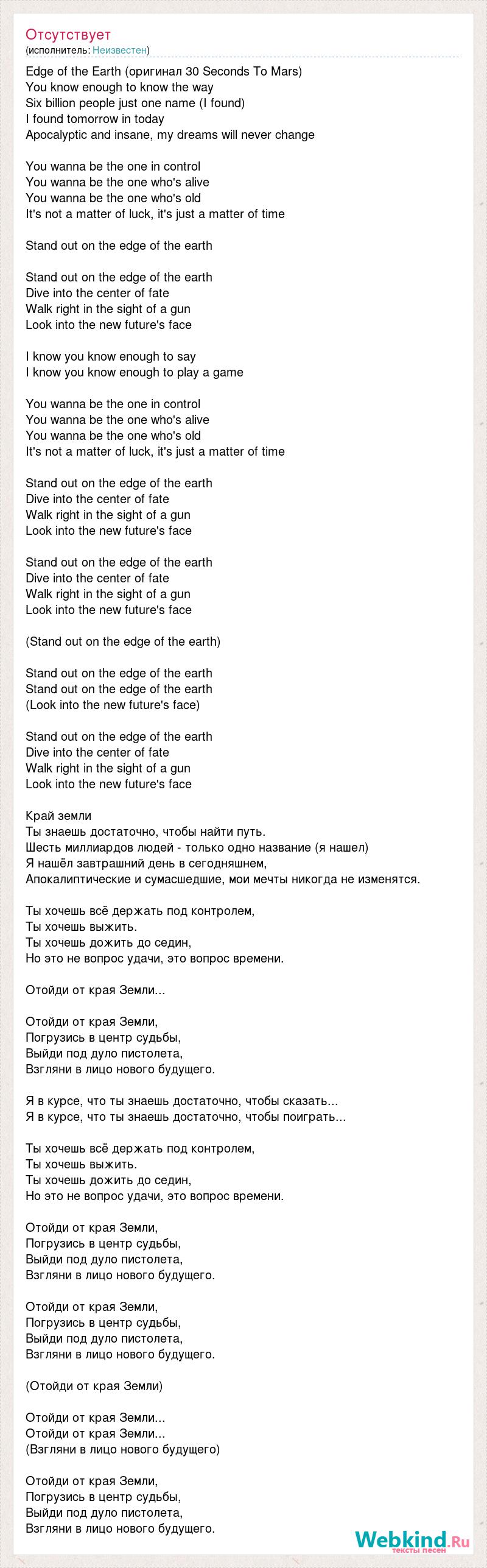 Edge of the Earth (оригинал 30 Seconds To Mars) You know enough to know the way Six billion people just one name (I found) I found tomorrow in today Apocalyptic and insane, my dreams will never change You wanna be the one in control You wanna be the one who's alive You wanna be the one who's old It's not a matter of luck, it's just a matter of time Stand out on the edge of the earth Stand out on the edge of the earth Dive into the center of fate Walk right in the sight of a gun Look into the new future's face I know you know enough to say I know you know enough to play a game You wanna be the one in control You wanna be the one who's alive You wanna be the one who's old It's not a matter of luck, it's just a matter of time Stand out on the edge of the earth Dive into the center of fate Walk right in the sight of a gun Look into the new future's face Stand out on the edge of the earth Dive into the center of fate Walk right in the sight of a gun Look into the new future's face (Stand out on the edge of the earth) Stand out on the edge of the earth Stand out on the edge of the earth (Look into the new future's face) Stand out on the edge of the earth Dive into the center of fate Walk right in the sight of a gun Look into the new future's face Край земли Ты знаешь достаточно, чтобы найти путь. Шесть миллиардов людей - только одно название (я нашел) Я нашёл завтрашний день в сегодняшнем, Апокалиптические и сумасшедшие, мои мечты никогда не изменятся. Ты хочешь всё держать под контролем, Ты хочешь выжить. Ты хочешь дожить до седин, Но это не вопрос удачи, это вопрос времени. Отойди от края Земли... Отойди от края Земли, Погрузись в центр судьбы, Выйди под дуло пистолета, Взгляни в лицо нового будущего. Я в курсе, что ты знаешь достаточно, чтобы сказать... Я в курсе, что ты знаешь достаточно, чтобы поиграть... Ты хочешь всё держать под контролем, Ты хочешь выжить. Ты хочешь дожить до седин, Но это не вопрос удачи, это вопрос времени. Отойди от края Земли, Погрузись в центр судьбы, Выйди под дуло пистолета, Взгляни в лицо нового будущего. Отойди от края Земли, Погрузись в центр судьбы, Выйди под дуло пистолета, Взгляни в лицо нового будущего. (Отойди от края Земли) Отойди от края Земли... Отойди от края Земли... (Взгляни в лицо нового будущего) Отойди от края Земли, Погрузись в центр судьбы, Выйди под дуло пистолета, Взгляни в лицо нового будущего.