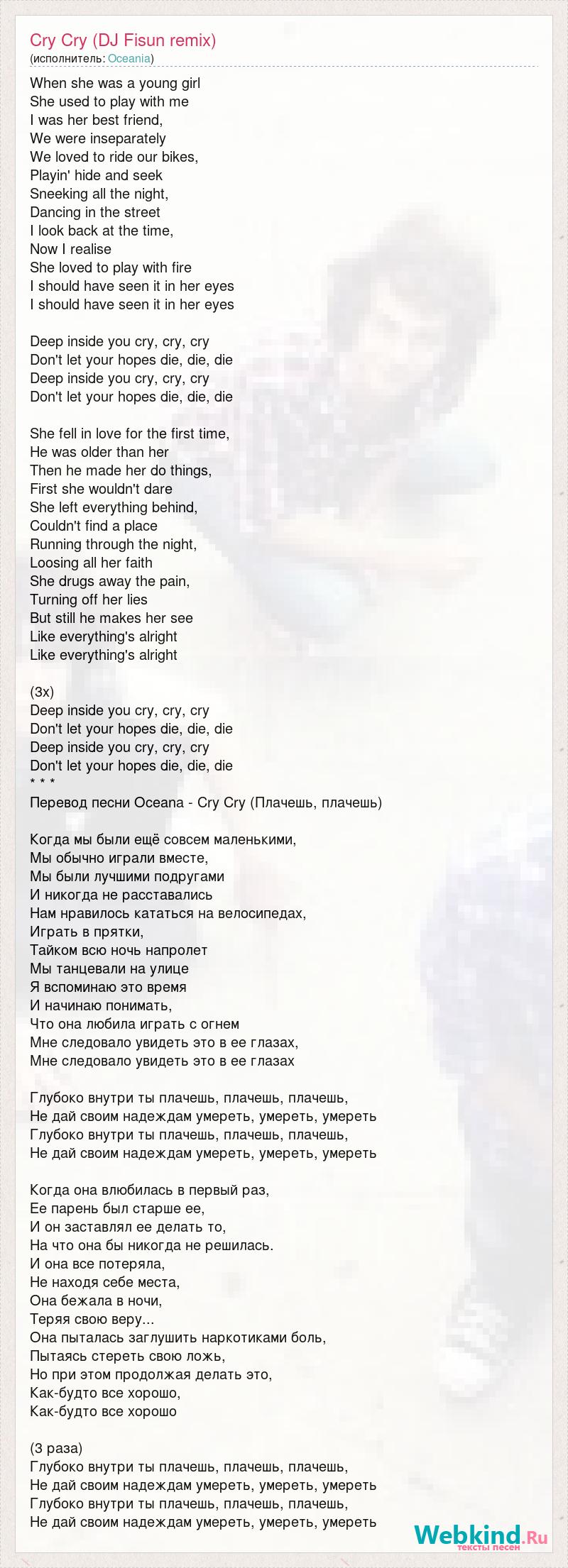 When she was a young girl She used to play with me I was her best friend, We were inseparately We loved to ride our bikes, Playin' hide and seek Sneeking all the night, Dancing in the street I look back at the time, Now I realise She loved to play with fire I should have seen it in her eyes I should have seen it in her eyes Deep inside you cry, cry, cry Don't let your hopes die, die, die Deep inside you cry, cry, cry Don't let your hopes die, die, die She fell in love for the first time, He was older than her Then he made her do things, First she wouldn't dare She left everything behind, Couldn't find a place Running through the night, Loosing all her faith She drugs away the pain, Turning off her lies But still he makes her see Like everything's alright Like everything's alright (3x) Deep inside you cry, cry, cry Don't let your hopes die, die, die Deep inside you cry, cry, cry Don't let your hopes die, die, die * * * Перевод песни Oceana - Cry Cry (Плачешь, плачешь) Когда мы были ещё совсем маленькими, Мы обычно играли вместе, Мы были лучшими подругами И никогда не расставались Нам нравилось кататься на велосипедах, Играть в прятки, Тайком всю ночь напролет Мы танцевали на улице Я вспоминаю это время И начинаю понимать, Что она любила играть с огнем Мне следовало увидеть это в ее глазах, Мне следовало увидеть это в ее глазах Глубоко внутри ты плачешь, плачешь, плачешь, Не дай своим надеждам умереть, умереть, умереть Глубоко внутри ты плачешь, плачешь, плачешь, Не дай своим надеждам умереть, умереть, умереть Когда она влюбилась в первый раз, Ее парень был старше ее, И он заставлял ее делать то, На что она бы никогда не решилась. И она все потеряла, Не находя себе места, Она бежала в ночи, Теряя свою веру... Она пыталась заглушить наркотиками боль, Пытаясь стереть свою ложь, Но при этом продолжая делать это, Как-будто все хорошо, Как-будто все хорошо (3 раза) Глубоко внутри ты плачешь, плачешь, плачешь, Не дай своим надеждам умереть, умереть, умереть Глубоко внутри ты плачешь, плачешь, плачешь, Не дай своим надеждам умереть, умереть, умереть