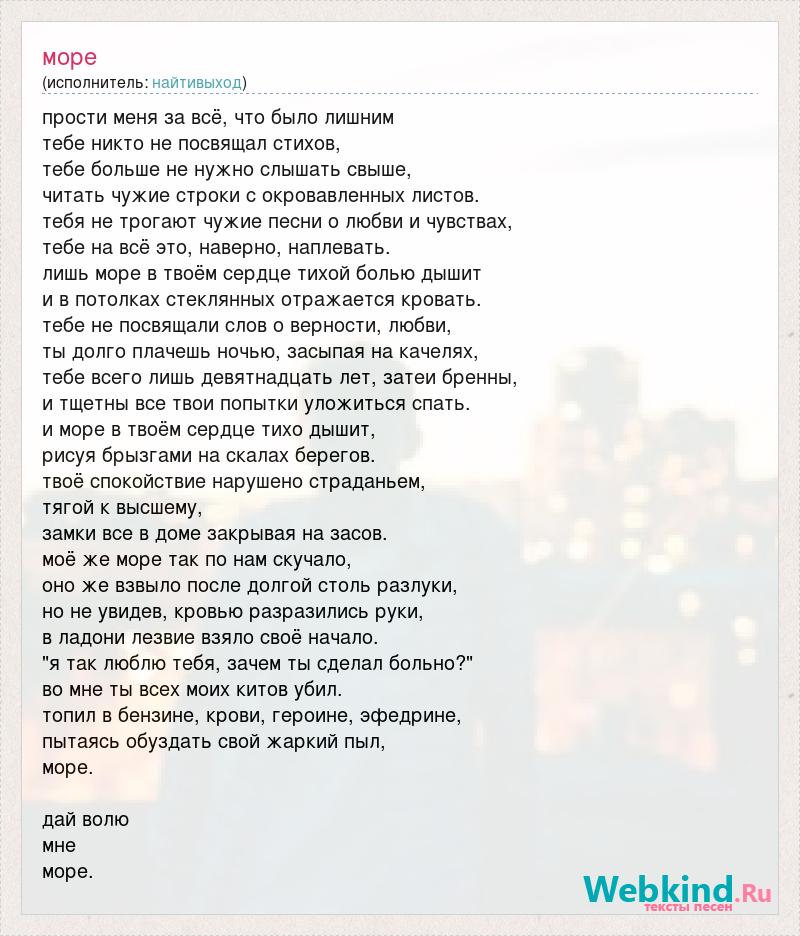 прости меня за всё, что было лишним тебе никто не посвящал стихов, тебе больше не нужно слышать свыше, читать чужие строки с окровавленных листов. тебя не трогают чужие песни о любви и чувствах, тебе на всё это, наверно, наплевать. лишь море в твоём сердце тихой болью дышит и в потолках стеклянных отражается кровать. тебе не посвящали слов о верности, любви, ты долго плачешь ночью, засыпая на качелях, тебе всего лишь девятнадцать лет, затеи бренны, и тщетны все твои попытки уложиться спать. и море в твоём сердце тихо дышит, рисуя брызгами на скалах берегов. твоё спокойствие нарушено страданьем, тягой к высшему, замки все в доме закрывая на засов. моё же море так по нам скучало, оно же взвыло после долгой столь разлуки, но не увидев, кровью разразились руки, в ладони лезвие взяло своё начало. "я так люблю тебя, зачем ты сделал больно?" во мне ты всех моих китов убил. топил в бензине, крови, героине, эфедрине, пытаясь обуздать свой жаркий пыл, море. дай волю мне море.