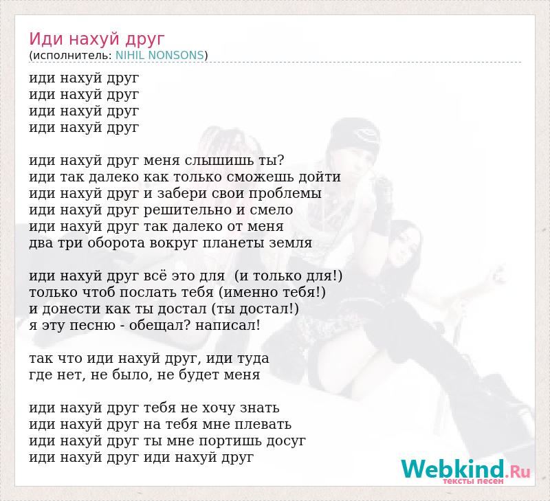 иди нахуй друг иди нахуй друг иди нахуй друг иди нахуй друг иди нахуй друг меня слышишь ты? иди так далеко как только сможешь дойти иди нахуй друг и забери свои проблемы иди нахуй друг решительно и смело иди нахуй друг так далеко от меня два три оборота вокруг планеты земля иди нахуй друг всё это для (и только для!) только чтоб послать тебя (именно тебя!) и донести как ты достал (ты достал!) я эту песню - обещал? написал! так что иди нахуй друг, иди туда где нет, не было, не будет меня иди нахуй друг тебя не хочу знать иди нахуй друг на тебя мне плевать иди нахуй друг ты мне портишь досуг иди нахуй друг иди нахуй друг