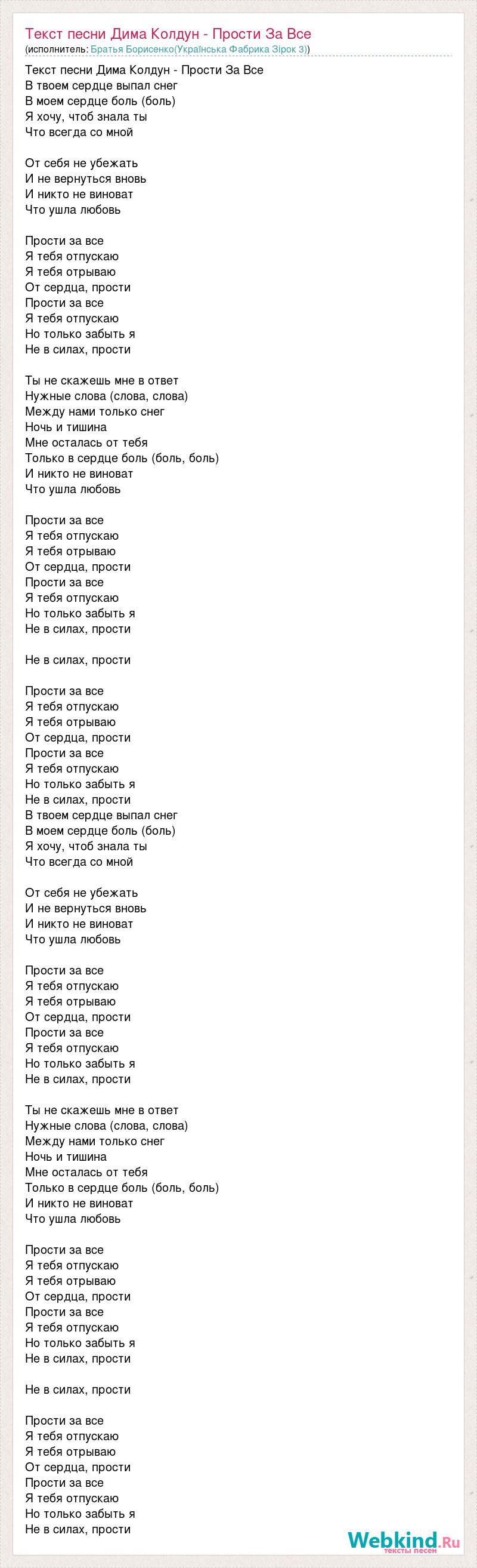 Текст песни Дима Колдун - Прости За Все В твоем сердце выпал снег В моем сердце боль (боль) Я хочу, чтоб знала ты Что всегда со мной От себя не убежать И не вернуться вновь И никто не виноват Что ушла любовь Прости за все Я тебя отпускаю Я тебя отрываю От сердца, прости Прости за все Я тебя отпускаю Но только забыть я Не в силах, прости Ты не скажешь мне в ответ Нужные слова (слова, слова) Между нами только снег Ночь и тишина Мне осталась от тебя Только в сердце боль (боль, боль) И никто не виноват Что ушла любовь Прости за все Я тебя отпускаю Я тебя отрываю От сердца, прости Прости за все Я тебя отпускаю Но только забыть я Не в силах, прости Не в силах, прости Прости за все Я тебя отпускаю Я тебя отрываю От сердца, прости Прости за все Я тебя отпускаю Но только забыть я Не в силах, прости В твоем сердце выпал снег В моем сердце боль (боль) Я хочу, чтоб знала ты Что всегда со мной От себя не убежать И не вернуться вновь И никто не виноват Что ушла любовь Прости за все Я тебя отпускаю Я тебя отрываю От сердца, прости Прости за все Я тебя отпускаю Но только забыть я Не в силах, прости Ты не скажешь мне в ответ Нужные слова (слова, слова) Между нами только снег Ночь и тишина Мне осталась от тебя Только в сердце боль (боль, боль) И никто не виноват Что ушла любовь Прости за все Я тебя отпускаю Я тебя отрываю От сердца, прости Прости за все Я тебя отпускаю Но только забыть я Не в силах, прости Не в силах, прости Прости за все Я тебя отпускаю Я тебя отрываю От сердца, прости Прости за все Я тебя отпускаю Но только забыть я Не в силах, прости