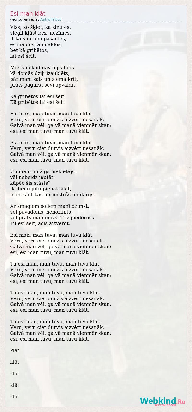 Viss, ko šķiet, ka zinu es, viegli kļūst bez nozīmes. It kā simtiem pasaulēs, es maldos, apmaldos, bet kā gribētos, lai esi šeit. Miers nekad nav bijis tāds kā domās dziļi izauklēts, pār mani sals un ziema krīt, prāts pagurst sevi apvaldīt. Kā gribētos lai esi šeit. Kā gribētos lai esi šeit. Esi man, man tuvu, man tuvu klāt. Veru, veru ciet durvis aizvērt nesanāk. Galvā man vēl, galvā manā vienmēr skan: esi, esi man tuvu, man tuvu klāt. Esi man, man tuvu, man tuvu klāt. Veru, veru ciet durvis aizvērt nesanāk. Galvā man vēl, galvā manā vienmēr skan: esi, esi man tuvu, man tuvu klāt. Un manī mūžīgs meklētājs, vēl nebeidz jautāt: kāpēc šis stāsts? Ik dienu jūtu pienāk klāt, man kaut kas nerimstošs un dārgs. Ar smagiem soļiem manī dzimst, vēl pavadonis, nenorimts, vēl prāts man možs, Tev piederošs. Tu esi šeit, acis aizverot. Esi man, man tuvu, man tuvu klāt. Veru, veru ciet durvis aizvērt nesanāk. Galvā man vēl, galvā manā vienmēr skan: esi, esi man tuvu, man tuvu klāt. Tu esi man, man tuvu, man tuvu klāt. Veru, veru ciet durvis aizvērt nesanāk. Galvā man vēl, galvā manā vienmēr skan: esi, esi man tuvu, man tuvu klāt. Tu esi man, man tuvu, man tuvu klāt. Veru, veru ciet durvis aizvērt nesanāk. Galvā man vēl, galvā manā vienmēr skan: esi, esi man tuvu, man tuvu klāt. Tu esi man, man tuvu, man tuvu klāt. Veru, veru ciet durvis aizvērt nesanāk. Galvā man vēl, galvā manā vienmēr skan: esi, esi man tuvu, man tuvu klāt. klāt klāt klāt klāt klāt