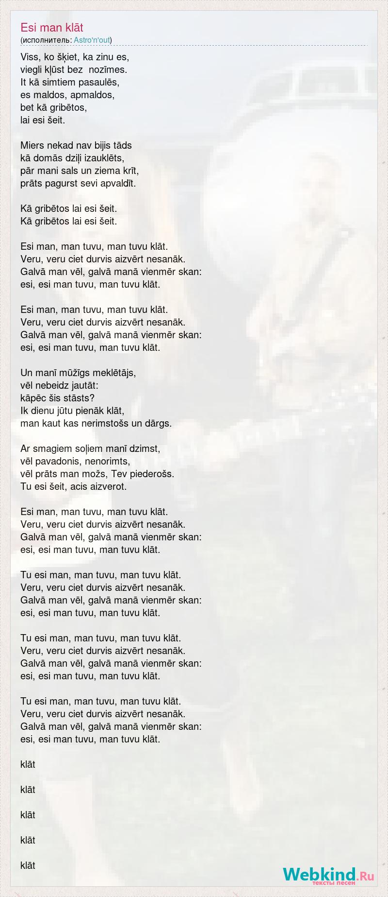 Viss, ko šķiet, ka zinu es, viegli kļūst bez nozīmes. It kā simtiem pasaulēs, es maldos, apmaldos, bet kā gribētos, lai esi šeit. Miers nekad nav bijis tāds kā domās dziļi izauklēts, pār mani sals un ziema krīt, prāts pagurst sevi apvaldīt. Kā gribētos lai esi šeit. Kā gribētos lai esi šeit. Esi man, man tuvu, man tuvu klāt. Veru, veru ciet durvis aizvērt nesanāk. Galvā man vēl, galvā manā vienmēr skan: esi, esi man tuvu, man tuvu klāt. Esi man, man tuvu, man tuvu klāt. Veru, veru ciet durvis aizvērt nesanāk. Galvā man vēl, galvā manā vienmēr skan: esi, esi man tuvu, man tuvu klāt. Un manī mūžīgs meklētājs, vēl nebeidz jautāt: kāpēc šis stāsts? Ik dienu jūtu pienāk klāt, man kaut kas nerimstošs un dārgs. Ar smagiem soļiem manī dzimst, vēl pavadonis, nenorimts, vēl prāts man možs, Tev piederošs. Tu esi šeit, acis aizverot. Esi man, man tuvu, man tuvu klāt. Veru, veru ciet durvis aizvērt nesanāk. Galvā man vēl, galvā manā vienmēr skan: esi, esi man tuvu, man tuvu klāt. Tu esi man, man tuvu, man tuvu klāt. Veru, veru ciet durvis aizvērt nesanāk. Galvā man vēl, galvā manā vienmēr skan: esi, esi man tuvu, man tuvu klāt. Tu esi man, man tuvu, man tuvu klāt. Veru, veru ciet durvis aizvērt nesanāk. Galvā man vēl, galvā manā vienmēr skan: esi, esi man tuvu, man tuvu klāt. Tu esi man, man tuvu, man tuvu klāt. Veru, veru ciet durvis aizvērt nesanāk. Galvā man vēl, galvā manā vienmēr skan: esi, esi man tuvu, man tuvu klāt. klāt klāt klāt klāt klāt