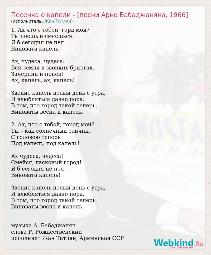 1. Ах что с тобой, горд мой? Ты поешь и смеешься. Я б сегодня не пел – Виновата капель. Ах, чудеса, чудеса: Вся земля в звонких брызгах, - Зачерпни и попей! Ах, капель, ах, капель! Звенит капель целый день с утра, И влюбляться давно пора. В том, что город такой теперь, Виноваты весна и капель. 2. Ах, что с тобой, город мой? Ты – как солнечный зайчик, С головою теперь Под капель, под капель! Ах чудеса, чудеса! Смейся, ласковый город! Я б сегодня не пел – Виновата капель! Звенит капель целый день с утра, И влюбляться давно пора. В том, что город такой теперь, Виноваты весна и капель. ___ музыка А. Бабаджанян слова Р. Рождественский исполняет Жан Татлян, Армянская ССР