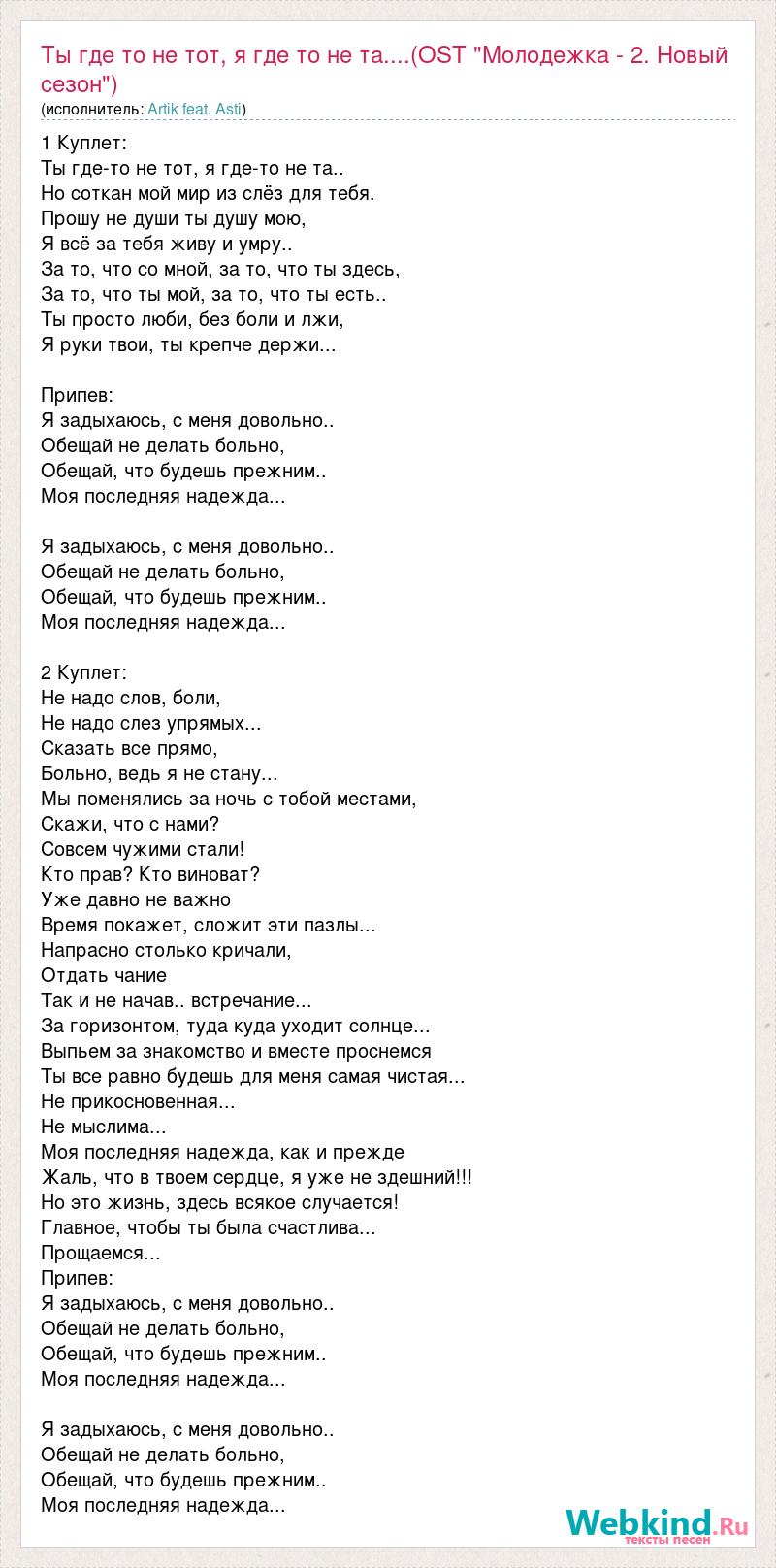Главная→Исполнители→Artik feat. Asti→Ты где то не тот, я где то не та....(OST "Молодежка - 2. Новый сезон")