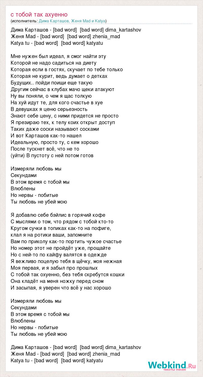 Дима Карташов - [bad word] [bad word] dima_kartashov Женя Mad - [bad word] [bad word] zhenia_mad Katya tu - [bad word] [bad word] katyatu Мне нужен был идеал, я смог найти эту Которой не надо садиться на диету Которая если в гостях, скучает по тебе только Которая не курит, ведь думает о детках Будущих.. пойди поищи еще такую Другим сейчас в клубах мачо щеки атакуют Ну вы поняли, о чем я щас толкую На хуй идут те, для кого счастье в хуе В девушках я ценю серьезность Знают себе цену, с ними придется не просто Я презираю тех, к телу коих открыт доступ Таких даже соски называют сосками И вот Карташов как-то нашел Идеальную, просто ту, с кем хорошо После тускнет всё, что не то (уйти) В пустоту с ней потом готов Измеряли любовь мы Секундами В этом время с тобой мы Влюблены Но нервы - побитые Ты любовь не убей мою Я добавлю себе бэйлис в горячий кофе С мыслями о том, что рядом с тобой кто-то Кругом сучки в топиках как-то на пофиге, клал я на ротики ваши, запомните Вам по приколу как-то портить чужое счастье Но номер этот не пройдёт уже, прощайте Но с ней-то по кайфу валятся в одежде Я вежливо поцелую тебя в щёчку, моя нежная Моя первая, и я забыл про прошлых С тобой так охуенно, без тебя скребутся кошки Она кладёт на меня ножку перед сном И засыпая, я уверен что всё у нас хорошо Измеряли любовь мы Секундами В этом время с тобой мы Влюблены Но нервы - побитые Ты любовь не убей мою Дима Карташов - [bad word] [bad word] dima_kartashov Женя Mad - [bad word] [bad word] zhenia_mad Katya tu - [bad word] [bad word] katyatu