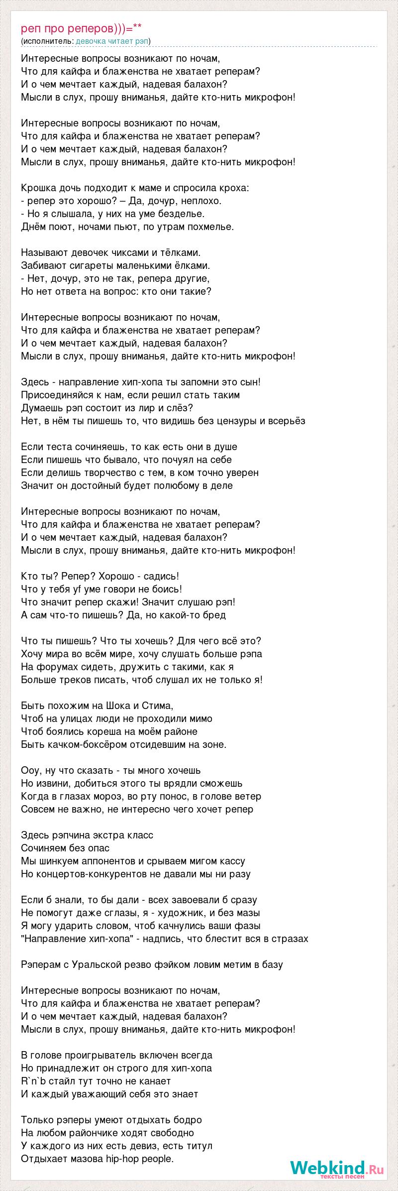 Интересные вопросы возникают по ночам, Что для кайфа и блаженства не хватает реперам? И о чем мечтает каждый, надевая балахон? Мысли в слух, прошу вниманья, дайте кто-нить микрофон! Интересные вопросы возникают по ночам, Что для кайфа и блаженства не хватает реперам? И о чем мечтает каждый, надевая балахон? Мысли в слух, прошу вниманья, дайте кто-нить микрофон! Крошка дочь подходит к маме и спросила кроха: - репер это хорошо? – Да, дочур, неплохо. - Но я слышала, у них на уме безделье. Днём поют, ночами пьют, по утрам похмелье. Называют девочек чиксами и тёлками. Забивают сигареты маленькими ёлками. - Нет, дочур, это не так, репера другие, Но нет ответа на вопрос: кто они такие? Интересные вопросы возникают по ночам, Что для кайфа и блаженства не хватает реперам? И о чем мечтает каждый, надевая балахон? Мысли в слух, прошу вниманья, дайте кто-нить микрофон! Здесь - направление хип-хопа ты запомни это сын! Присоединяйся к нам, если решил стать таким Думаешь рэп состоит из лир и слёз? Нет, в нём ты пишешь то, что видишь без цензуры и всерьёз Если теста сочиняешь, то как есть они в душе Если пишешь что бывало, что почуял на себе Если делишь творчество с тем, в ком точно уверен Значит он достойный будет полюбому в деле Интересные вопросы возникают по ночам, Что для кайфа и блаженства не хватает реперам? И о чем мечтает каждый, надевая балахон? Мысли в слух, прошу вниманья, дайте кто-нить микрофон! Кто ты? Репер? Хорошо - садись! Что у тебя yf уме говори не боись! Что значит репер скажи! Значит слушаю рэп! А сам что-то пишешь? Да, но какой-то бред Что ты пишешь? Что ты хочешь? Для чего всё это? Хочу мира во всём мире, хочу слушать больше рэпа На форумах сидеть, дружить с такими, как я Больше треков писать, чтоб слушал их не только я! Быть похожим на Шока и Стима, Чтоб на улицах люди не проходили мимо Чтоб боялись кореша на моём районе Быть качком-боксёром отсидевшим на зоне. Ооу, ну что сказать - ты много хочешь Но извини, добиться этого ты врядли сможешь Когда в глазах мороз, во рту понос, в голове ветер Совсем не важно, не интересно чего хочет репер Здесь рэпчина экстра класс Сочиняем без опас Мы шинкуем аппонентов и срываем мигом кассу Но концертов-конкурентов не давали мы ни разу Если б знали, то бы дали - всех завоевали б сразу Не помогут даже сглазы, я - художник, и без мазы Я могу ударить словом, чтоб качнулись ваши фазы "Направление хип-хопа" - надпись, что блестит вся в стразах Рэперам с Уральской резво фэйком ловим метим в базу Интересные вопросы возникают по ночам, Что для кайфа и блаженства не хватает реперам? И о чем мечтает каждый, надевая балахон? Мысли в слух, прошу вниманья, дайте кто-нить микрофон! В голове проигрыватель включен всегда Но принадлежит он строго для хип-хопа R`n`b стайл тут точно не канает И каждый уважающий себя это знает Только рэперы умеют отдыхать бодро На любом райончике ходят свободно У каждого из них есть девиз, есть титул Отдыхает мазова hip-hop people.