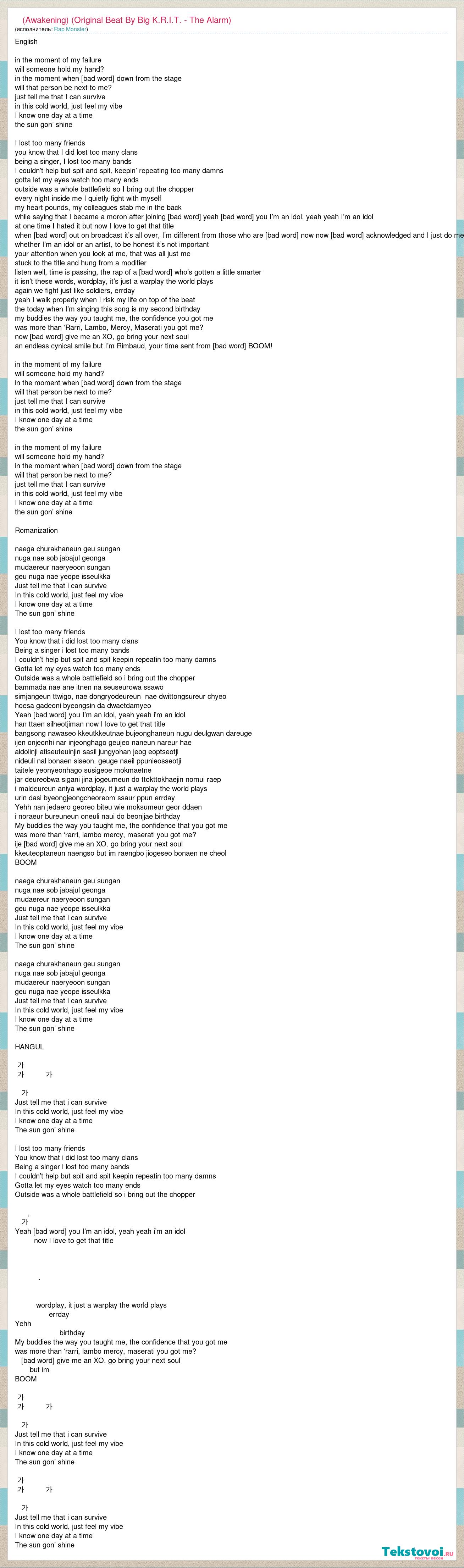 English in the moment of my failure will someone hold my hand? in the moment when I come down from the stage will that person be next to me? just tell me that I can survive in this cold world, just feel my vibe I know one day at a time the sun gon’ shine I lost too many friends you know that I did lost too many clans being a singer, I lost too many bands I couldn’t help but spit and spit, keepin’ repeating too many damns gotta let my eyes watch too many ends outside was a whole battlefield so I bring out the chopper every night inside me I quietly fight with myself my heart pounds, my colleagues stab me in the back while saying that I became a moron after joining a company yeah [bad word] you I’m an idol, yeah yeah I’m an idol at one time I hated it but now I love to get that title when I come out on broadcast it’s all over, I’m different from those who are corrupted now now I’m completely acknowledged and I just do me whether I’m an idol or an artist, to be honest it’s not important your attention when you look at me, that was all just me stuck to the title and hung from a modifier listen well, time is passing, the rap of a [bad word] who’s gotten a little smarter it isn’t these words, wordplay, it’s just a warplay the world plays again we fight just like soldiers, errday yeah I walk properly when I risk my life on top of the beat the today when I’m singing this song is my second birthday my buddies the way you taught me, the confidence you got me was more than ‘Rarri, Lambo, Mercy, Maserati you got me? now just come give me an XO, go bring your next soul an endless cynical smile but I’m Rimbaud, your time sent from hell BOOM! in the moment of my failure will someone hold my hand? in the moment when I come down from the stage will that person be next to me? just tell me that I can survive in this cold world, just feel my vibe I know one day at a time the sun gon’ shine in the moment of my failure will someone hold my hand? in the moment when I come down from the stage will that person be next to me? just tell me that I can survive in this cold world, just feel my vibe I know one day at a time the sun gon’ shine Romanization naega churakhaneun geu sungan nuga nae sob jabajul geonga mudaereur naeryeoon sungan geu nuga nae yeope isseulkka Just tell me that i can survive In this cold world, just feel my vibe I know one day at a time The sun gon’ shine I lost too many friends You know that i did lost too many clans Being a singer i lost too many bands I couldn’t help but spit and spit keepin repeatin too many damns Gotta let my eyes watch too many ends Outside was a whole battlefield so i bring out the chopper bammada nae ane itnen na seuseurowa ssawo simjangeun ttwigo, nae dongryodeureun nae dwittongsureur chyeo hoesa gadeoni byeongsin da dwaetdamyeo Yeah [bad word] you I’m an idol, yeah yeah i’m an idol han ttaen silheotjiman now I love to get that title bangsong nawaseo kkeutkkeutnae bujeonghaneun nugu deulgwan dareuge ijen onjeonhi nar injeonghago geujeo naneun nareur hae aidolinji atiseuteuinjin sasil jungyohan jeog eoptseotji nideuli nal bonaen siseon. geuge naeil ppunieosseotji taitele yeonyeonhago susigeoe mokmaetne jar deureobwa sigani jina jogeumeun do ttokttokhaejin nomui raep i maldeureun aniya wordplay, it just a warplay the world plays urin dasi byeongjeongcheoreom ssaur ppun errday Yehh nan jedaero georeo biteu wie moksumeur geor ddaen i noraeur bureuneun oneuli naui do beonjjae birthday My buddies the way you taught me, the confidence that you got me was more than ‘rarri, lambo mercy, maserati you got me? ije geunyang come give me an XO. go bring your next soul kkeuteoptaneun naengso but im raengbo jiogeseo bonaen ne cheol BOOM naega churakhaneun geu sungan nuga nae sob jabajul geonga mudaereur naeryeoon sungan geu nuga nae yeope isseulkka Just tell me that i can survive In this cold world, just feel my vibe I know one day at a time The sun gon’ shine naega churakhaneun geu sungan nuga nae sob jabajul geonga mudaereur naeryeoon sungan geu nuga nae yeope isseulkka Just tell me that i can survive In this cold world, just feel my vibe I know one day at a time The sun gon’ shine HANGUL 내가 추락하는 그 순간 누가 내 손 잡아줄 건가 무대를 내려온 순간 그 누가 내 옆에 있을까 Just tell me that i can survive In this cold world, just feel my vibe I know one day at a time The sun gon’ shine I lost too many friends You know that i did lost too many clans Being a singer i lost too many bands I couldn’t help but spit and spit keepin repeatin too many damns Gotta let my eyes watch too many ends Outside was a whole battlefield so i bring out the chopper 밤마다 내 안에 있는 나 스스로와 싸워 심장은 뛰고, 내 동료들은 내 뒷통수를 쳐 회사 가더니 병신 다 됐다며 Yeah [bad word] you I’m an idol, yeah yeah i’m an idol 한 땐 싫었지만 now I love to get that title 방송 나와서 끝끝내 부정하는 누구들관 다르게 이젠 온전히 날 인정하고 그저 나는 나를 해 아이돌인지 아티스트인진 사실 중요한 적 없었지 니들이 날 보는 시선. 그게 나일 뿐이었었지 타이틀에 연연하고 수식어에 목맸네 잘 들어봐 시간이 지나 조금은 더 똑똑해진 놈의 랩 이 말들은 아니야 wordplay, it just a warplay the world plays 우린 다시 병정처럼 싸울 뿐 errday Yehh 난 제대로 걸어 비트 위에 목숨을 걸 땐 이 노랠 부르는 오늘이 나의 두 번째 birthday My buddies the way you taught me, the confidence that you got me was more than ‘rarri, lambo mercy, maserati you got me? 이제 그냥 come give me an XO. go bring your next soul 끝없는 냉소 but im 랭보 지옥에서 보낸 네 철 BOOM 내가 추락하는 그 순간 누가 내 손 잡아줄 건가 무대를 내려온 순간 그 누가 내 옆에 있을까 Just tell me that i can survive In this cold world, just fee