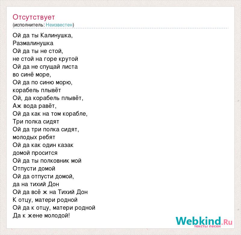 Ой да ты Калинушка, Размалинушка Ой да ты не стой, не стой на горе крутой Ой да не спущай листа во синё море, Ой да по синю морю, корабель плывёт Ой, да корабель плывёт, Аж вода равёт, Ой да как на том корабле, Три полка сидят Ой да три полка сидят, молодых ребят Ой да как один казак домой просится Ой да ты полковник мой Отпусти домой Ой да отпусти домой, да на тихий Дон Ой да всё ж на Тихий Дон К отцу, матери родной Ой да к отцу, матери родной Да к жене молодой!