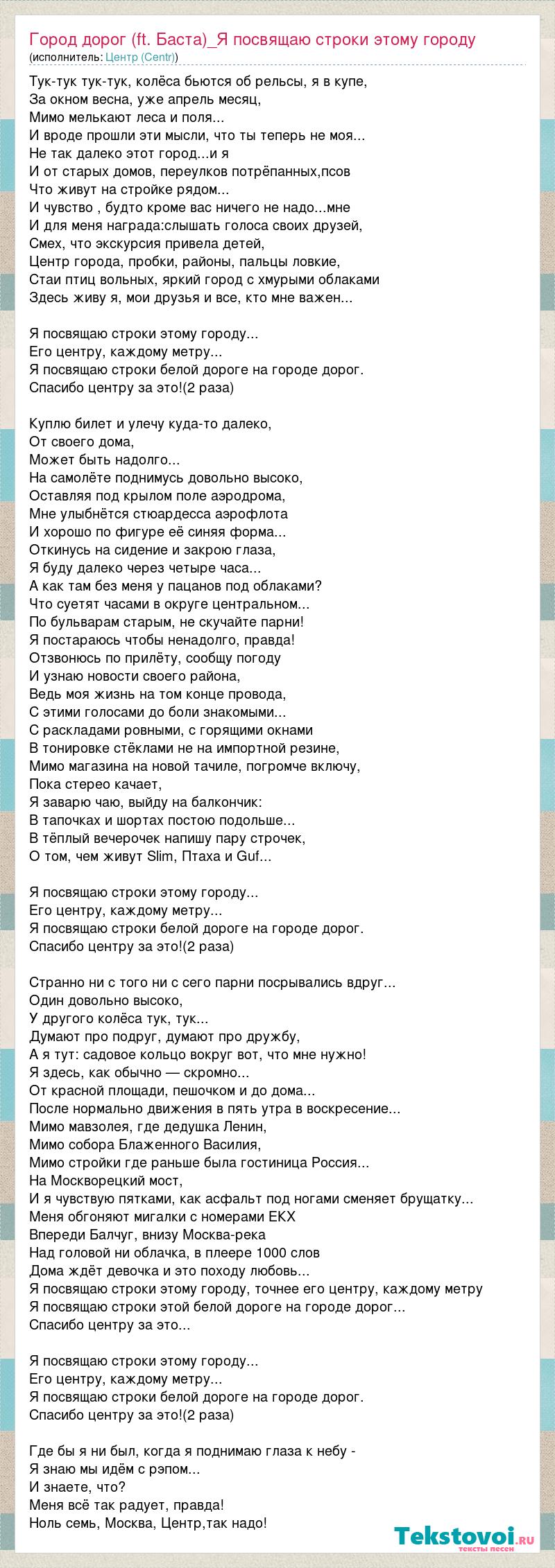 Тук-тук тук-тук, колёса бьются об рельсы, я в купе, За окном весна, уже апрель месяц, Мимо мелькают леса и поля... И вроде прошли эти мысли, что ты теперь не моя... Не так далеко этот город...и я И от старых домов, переулков потрёпанных,псов Что живут на стройке рядом... И чувство , будто кроме вас ничего не надо...мне И для меня награда:слышать голоса своих друзей, Смех, что экскурсия привела детей, Центр города, пробки, районы, пальцы ловкие, Стаи птиц вольных, яркий город с хмурыми облаками Здесь живу я, мои друзья и все, кто мне важен... Я посвящаю строки этому городу... Его центру, каждому метру... Я посвящаю строки белой дороге на городе дорог. Спасибо центру за это!(2 раза) Куплю билет и улечу куда-то далеко, От своего дома, Может быть надолго... На самолёте поднимусь довольно высоко, Оставляя под крылом поле аэродрома, Мне улыбнётся стюардесса аэрофлота И хорошо по фигуре её синяя форма... Откинусь на сидение и закрою глаза, Я буду далеко через четыре часа... А как там без меня у пацанов под облаками? Что суетят часами в округе центральном... По бульварам старым, не скучайте парни! Я постараюсь чтобы ненадолго, правда! Отзвонюсь по прилёту, сообщу погоду И узнаю новости своего района, Ведь моя жизнь на том конце провода, С этими голосами до боли знакомыми... С раскладами ровными, с горящими окнами В тонировке стёклами не на импортной резине, Мимо магазина на новой тачиле, погромче включу, Пока стерео качает, Я заварю чаю, выйду на балкончик: В тапочках и шортах постою подольше... В тёплый вечерочек напишу пару строчек, О том, чем живут Slim, Птаха и Guf... Я посвящаю строки этому городу... Его центру, каждому метру... Я посвящаю строки белой дороге на городе дорог. Спасибо центру за это!(2 раза) Странно ни с того ни с сего парни посрывались вдруг... Один довольно высоко, У другого колёса тук, тук... Думают про подруг, думают про дружбу, А я тут: садовое кольцо вокруг вот, что мне нужно! Я здесь, как обычно — скромно... От красной площади, пешочком и до дома... После нормально движения в пять утра в воскресение... Мимо мавзолея, где дедушка Ленин, Мимо собора Блаженного Василия, Мимо стройки где раньше была гостиница Россия... На Москворецкий мост, И я чувствую пятками, как асфальт под ногами сменяет брущатку... Меня обгоняют мигалки с номерами ЕКХ Впереди Балчуг, внизу Москва-река Над головой ни облачка, в плеере 1000 слов Дома ждёт девочка и это походу любовь... Я посвящаю строки этому городу, точнее его центру, каждому метру Я посвящаю строки этой белой дороге на городе дорог... Спасибо центру за это... Я посвящаю строки этому городу... Его центру, каждому метру... Я посвящаю строки белой дороге на городе дорог. Спасибо центру за это!(2 раза) Где бы я ни был, когда я поднимаю глаза к небу - Я знаю мы идём с рэпом... И знаете, что? Меня всё так радует, правда! Ноль семь, Москва, Центр,так надо!