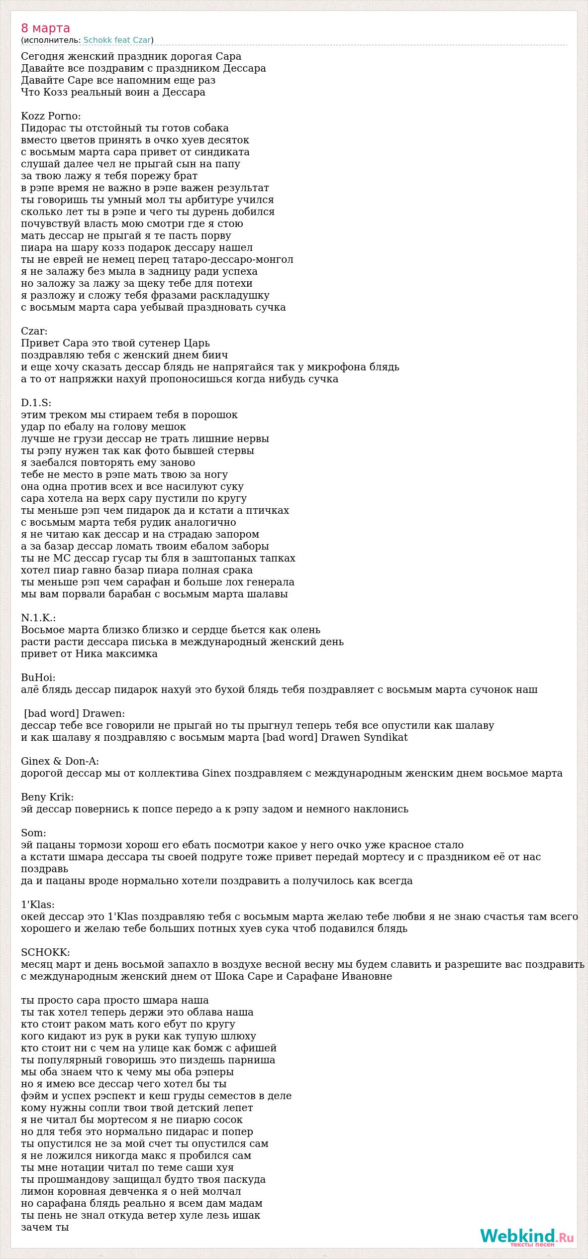 Сегодня женский праздник дорогая Сара Давайте все поздравим с праздником Дессара Давайте Саре все напомним еще раз Что Козз реальный воин а Дессара Kozz Porno: Пидорас ты отстойный ты готов собака вместо цветов принять в очко хуев десяток с восьмым марта сара привет от синдиката слушай далее чел не прыгай сын на папу за твою лажу я тебя порежу брат в рэпе время не важно в рэпе важен результат ты говоришь ты умный мол ты арбитуре учился сколько лет ты в рэпе и чего ты дурень добился почувствуй власть мою смотри где я стою мать дессар не прыгай я те пасть порву пиара на шару козз подарок дессару нашел ты не еврей не немец перец татаро-дессаро-монгол я не залажу без мыла в задницу ради успеха но заложу за лажу за щеку тебе для потехи я разложу и сложу тебя фразами раскладушку с восьмым марта сара уебывай праздновать сучка Czar: Привет Сара это твой сутенер Царь поздравляю тебя с женский днем биич и еще хочу сказать дессар блядь не напрягайся так у микрофона блядь а то от напряжки нахуй пропоносишься когда нибудь сучка D.1.S: этим треком мы стираем тебя в порошок удар по ебалу на голову мешок лучше не грузи дессар не трать лишние нервы ты рэпу нужен так как фото бывшей стервы я заебался повторять ему заново тебе не место в рэпе мать твою за ногу она одна против всех и все насилуют суку сара хотела на верх сару пустили по кругу ты меньше рэп чем пидарок да и кстати а птичках с восьмым марта тебя рудик аналогично я не читаю как дессар и на страдаю запором а за базар дессар ломать твоим ебалом заборы ты не МС дессар гусар ты бля в заштопаных тапках хотел пиар гавно базар пиара полная срака ты меньше рэп чем сарафан и больше лох генерала мы вам порвали барабан с восьмым марта шалавы N.1.K.: Восьмое марта близко близко и сердце бьется как олень расти расти дессара писька в международный женский день привет от Ника максимка BuHoi: алё блядь дессар пидарок нахуй это бухой блядь тебя поздравляет с восьмым марта сучонок наш [bad word] Drawen: дессар тебе все говорили не прыгай но ты прыгнул теперь тебя все опустили как шалаву и как шалаву я поздравляю с восьмым марта [bad word] Drawen Syndikat Ginex & Don-A: дорогой дессар мы от коллектива Ginex поздравляем с международным женским днем восьмое марта Beny Krik: эй дессар повернись к попсе передо а к рэпу задом и немного наклонись Som: эй пацаны тормози хорош его ебать посмотри какое у него очко уже красное стало а кстати шмара дессара ты своей подруге тоже привет передай мортесу и с праздником её от нас поздравь да и пацаны вроде нормально хотели поздравить а получилось как всегда 1'Klas: окей дессар это 1'Klas поздравляю тебя с восьмым марта желаю тебе любви я не знаю счастья там всего хорошего и желаю тебе больших потных хуев сука чтоб подавился блядь SCHOKK: месяц март и день восьмой запахло в воздухе весной весну мы будем славить и разрешите вас поздравить с международным женский днем от Шока Саре и Сарафане Ивановне ты просто сара просто шмара наша ты так хотел теперь держи это облава наша кто стоит раком мать кого ебут по кругу кого кидают из рук в руки как тупую шлюху кто стоит ни с чем на улице как бомж с афишей ты популярный говоришь это пиздешь парниша мы оба знаем что к чему мы оба рэперы но я имею все дессар чего хотел бы ты фэйм и успех рэспект и кеш груды семестов в деле кому нужны сопли твои твой детский лепет я не читал бы мортесом я не пиарю сосок н