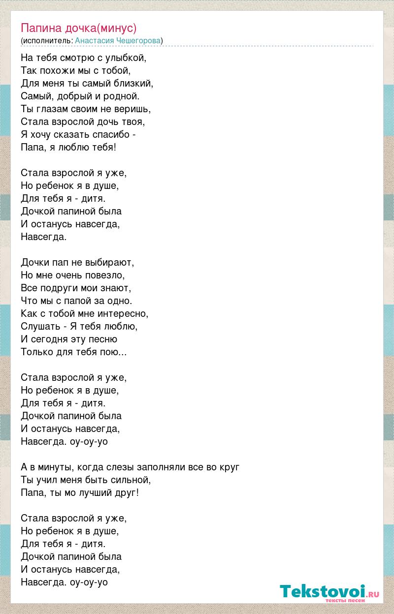 На тебя смотрю с улыбкой, Так похожи мы с тобой, Для меня ты самый близкий, Самый, добрый и родной. Ты глазам своим не веришь, Стала взрослой дочь твоя, Я хочу сказать спасибо - Папа, я люблю тебя! Стала взрослой я уже, Но ребенок я в душе, Для тебя я - дитя. Дочкой папиной была И останусь навсегда, Навсегда. Дочки пап не выбирают, Но мне очень повезло, Все подруги мои знают, Что мы с папой за одно. Как с тобой мне интересно, Слушать - Я тебя люблю, И сегодня эту песню Только для тебя пою... Стала взрослой я уже, Но ребенок я в душе, Для тебя я - дитя. Дочкой папиной была И останусь навсегда, Навсегда. оу-оу-уо А в минуты, когда слезы заполняли все во круг Ты учил меня быть сильной, Папа, ты мо лучший друг! Стала взрослой я уже, Но ребенок я в душе, Для тебя я - дитя. Дочкой папиной была И останусь навсегда, Навсегда. оу-оу-уо