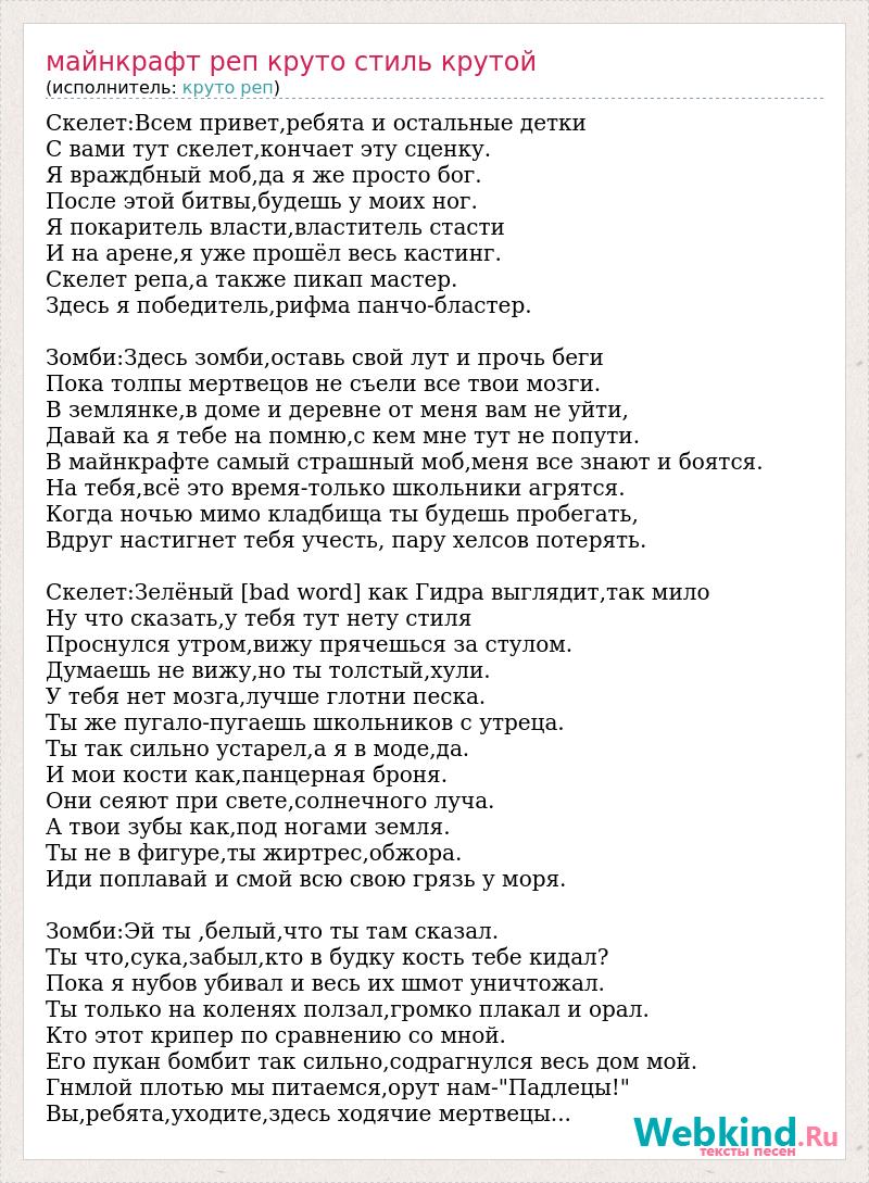 Скелет:Всем привет,ребята и остальные детки С вами тут скелет,кончает эту сценку. Я враждбный моб,да я же просто бог. После этой битвы,будешь у моих ног. Я покаритель власти,властитель стасти И на арене,я уже прошёл весь кастинг. Скелет репа,а также пикап мастер. Здесь я победитель,рифма панчо-бластер. Зомби:Здесь зомби,оставь свой лут и прочь беги Пока толпы мертвецов не съели все твои мозги. В землянке,в доме и деревне от меня вам не уйти, Давай ка я тебе на помню,с кем мне тут не попути. В майнкрафте самый страшный моб,меня все знают и боятся. На тебя,всё это время-только школьники агрятся. Когда ночью мимо кладбища ты будешь пробегать, Вдруг настигнет тебя учесть, пару хелсов потерять. Скелет:Зелёный [bad word] как Гидра выглядит,так мило Ну что сказать,у тебя тут нету стиля Проснулся утром,вижу прячешься за стулом. Думаешь не вижу,но ты толстый,хули. У тебя нет мозга,лучше глотни песка. Ты же пугало-пугаешь школьников с утреца. Ты так сильно устарел,а я в моде,да. И мои кости как,панцерная броня. Они сеяют при свете,солнечного луча. А твои зубы как,под ногами земля. Ты не в фигуре,ты жиртрес,обжора. Иди поплавай и смой всю свою грязь у моря. Зомби:Эй ты ,белый,что ты там сказал. Ты что,сука,забыл,кто в будку кость тебе кидал? Пока я нубов убивал и весь их шмот уничтожал. Ты только на коленях ползал,громко плакал и орал. Кто этот крипер по сравнению со мной. Его пукан бомбит так сильно,содрагнулся весь дом мой. Гнмлой плотью мы питаемся,орут нам-"Падлецы!" Вы,ребята,уходите,здесь ходячие мертвецы...