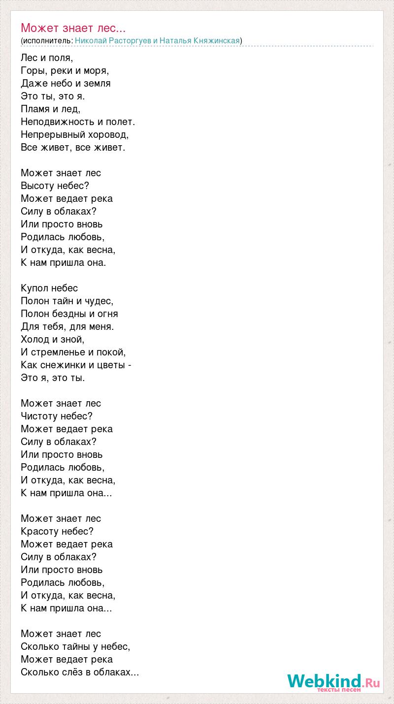 Лес и поля, Горы, реки и моря, Даже небо и земля Это ты, это я. Пламя и лед, Неподвижность и полет. Непрерывный хоровод, Все живет, все живет. Может знает лес Высоту небес? Может ведает река Силу в облаках? Или просто вновь Родилась любовь, И откуда, как весна, К нам пришла она. Купол небес Полон тайн и чудес, Полон бездны и огня Для тебя, для меня. Холод и зной, И стремленье и покой, Как снежинки и цветы - Это я, это ты. Может знает лес Чистоту небес? Может ведает река Силу в облаках? Или просто вновь Родилась любовь, И откуда, как весна, К нам пришла она... Может знает лес Красоту небес? Может ведает река Силу в облаках? Или просто вновь Родилась любовь, И откуда, как весна, К нам пришла она... Может знает лес Сколько тайны у небес, Может ведает река Сколько слёз в облаках...
