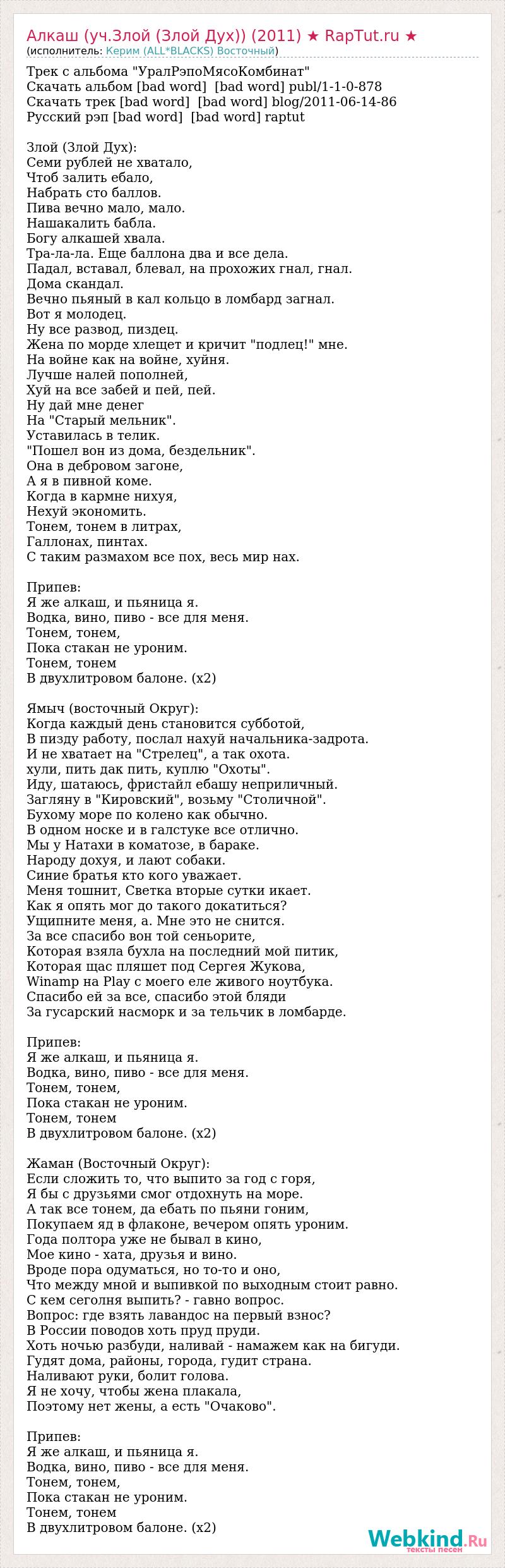 Трек с альбома "УралРэпоМясоКомбинат" Скачать альбом [bad word] [bad word] publ/1-1-0-878 Скачать трек [bad word] [bad word] blog/2011-06-14-86 Русский рэп [bad word] [bad word] raptut Злой (Злой Дух): Семи рублей не хватало, Чтоб залить ебало, Набрать сто баллов. Пива вечно мало, мало. Нашакалить бабла. Богу алкашей хвала. Тра-ла-ла. Еще баллона два и все дела. Падал, вставал, блевал, на прохожих гнал, гнал. Дома скандал. Вечно пьяный в кал кольцо в ломбард загнал. Вот я молодец. Ну все развод, пиздец. Жена по морде хлещет и кричит "подлец!" мне. На войне как на войне, хуйня. Лучше налей пополней, Хуй на все забей и пей, пей. Ну дай мне денег На "Старый мельник". Уставилась в телик. "Пошел вон из дома, бездельник". Она в дебровом загоне, А я в пивной коме. Когда в кармне нихуя, Нехуй экономить. Тонем, тонем в литрах, Галлонах, пинтах. С таким размахом все пох, весь мир нах. Припев: Я же алкаш, и пьяница я. Водка, вино, пиво - все для меня. Тонем, тонем, Пока стакан не уроним. Тонем, тонем В двухлитровом балоне. (x2) Ямыч (восточный Округ): Когда каждый день становится субботой, В пизду работу, послал нахуй начальника-задрота. И не хватает на "Стрелец", а так охота. хули, пить дак пить, куплю "Охоты". Иду, шатаюсь, фристайл ебашу неприличный. Загляну в "Кировский", возьму "Столичной". Бухому море по колено как обычно. В одном носке и в галстуке все отлично. Мы у Натахи в коматозе, в бараке. Народу дохуя, и лают собаки. Синие братья кто кого уважает. Меня тошнит, Светка вторые сутки икает. Как я опять мог до такого докатиться? Ущипните меня, а. Мне это не снится. За все спасибо вон той сеньорите, Которая взяла бухла на последний мой питик, Которая щас пляшет под Сергея Жукова, Winamp на Play с моего еле живого ноутбука. Спасибо ей за все, спасибо этой бляди За гусарский насморк и за тельчик в ломбарде. Припев: Я же алкаш, и пьяница я. Водка, вино, пиво - все для меня. Тонем, тонем, Пока стакан не уроним. Тонем, тонем В двухлитровом балоне. (x2) Жаман (Восточный Округ): Если сложить то, что выпито за год с горя, Я бы с друзьями смог отдохнуть на море. А так все тонем, да ебать по пьяни гоним, Покупаем яд в флаконе, вечером опять уроним. Года полтора уже не бывал в кино, Мое кино - хата, друзья и вино. Вроде пора одуматься, но то-то и оно, Что между мной и выпивкой по выходным стоит равно. С кем сеголня выпить? - гавно вопрос. Вопрос: где взять лавандос на первый взнос? В России поводов хоть пруд пруди. Хоть ночью разбуди, наливай - намажем как на бигуди. Гудят дома, районы, города, гудит страна. Наливают руки, болит голова. Я не хочу, чтобы жена плакала, Поэтому нет жены, а есть "Очаково". Припев: Я же алкаш, и пьяница я. Водка, вино, пиво - все для меня. Тонем, тонем, Пока стакан не уроним. Тонем, тонем В двухлитровом балоне. (x2)
