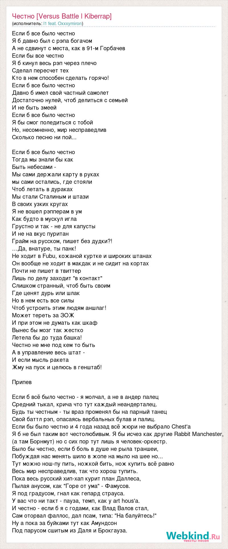 Если б все было честно Я б давно был с рэпа богачом А не сдвинут с места, как в 91-м Горбачев Если бы все честно Я б кинул весь рэп через плечо Сделал пересчет тех Кто в нем способен сделать горячо! Если б все было честно Давно б имел свой частный самолет Достаточно нулей, чтоб делиться с семьей И не быть змеей Если б все было честно Я бы смог поледиться с тобой Но, несомненно, мир несправедлив Сколько песню ни пой... Если б все было честно Тогда мы знали бы как Быть небесами - Мы сами держали карту в руках мы сами остались, где стояли Чтоб летать в дураках Мы стали Сталиным и штази В своих узких кругах Я не вошел рэпперам в ум Как будто в мускул игла Грустно и так - не для капусты И не на вкус пуритан Грайм на русском, пишет без дудки?! …Да, внатуре, ты панк! Не ходит в Fubu, кожаной куртке и широких штанах Он вообще не ходит в макдак и не сидит на кортах Почти не пишет в твиттер Лишь по делу заходит "в контакт" Слишком странный, чтоб быть своим Где ценят дурь или шлак Но в нем есть все силы Чтоб устроить этим людям аншлаг! Может тереть за ЗОЖ И при этом не думать как шкаф Вынес бы мозг так жестко Летела бы до туда башка! Честно не мне под кем то быть А в управление весь штат - И если мысль ракета Жму на пуск и целюсь в генштаб! Припев Если б всё было честно - я молчал, а не в андер палец Средний тыкал, крича что тут каждый неандерталец. Будь ты честным - ты враз променял бы на парный танец Свой баттл рэп, опасаясь вербальных булав и палиц. Если бы было честно и 4 года назад всё жюри не выбрало Chest'а Я б не был таким вот честолюбивым. Я бы исчез как другие Rabbit Manchester, (а там Борнмут) но с сих пор тут лишь я человек-оркестр. Было бы честно, если б боль в душе не рыла траншеи, Побуждая нас менять шило в жопе на мыло на шее но... Тут можно нош-пу пить, ножкой бить, нож купить всё равно Весь мир несправедлив, так что хорош тупить. Пока весь русский хип-хап курит план Даллеса, Пылая анусом, как "Горе от ума" - Фамусов. Я под градусом, гнал как гепард страуса. У вас что ни такт - пауза, темп, как у art hous'а. И честно - если б я с годами, как Влад Валов стал, Сам оторвал фаллос, дал псам, типа: "На балуйтесь!" Ну а пока за буйками тут как Амундсон Под парусом сшитым из Даля и Брокгауза.