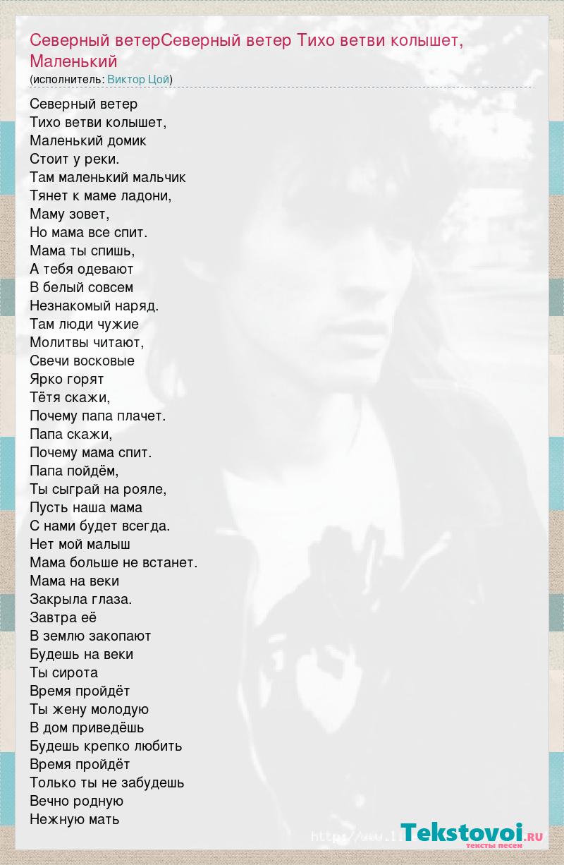 Северный ветер Тихо ветви колышет, Маленький домик Стоит у реки. Там маленький мальчик Тянет к маме ладони, Маму зовет, Но мама все спит. Мама ты спишь, А тебя одевают В белый совсем Незнакомый наряд. Там люди чужие Молитвы читают, Свечи восковые Ярко горят Тётя скажи, Почему папа плачет. Папа скажи, Почему мама спит. Папа пойдём, Ты сыграй на рояле, Пусть наша мама С нами будет всегда. Нет мой малыш Мама больше не встанет. Мама на веки Закрыла глаза. Завтра её В землю закопают Будешь на веки Ты сирота Время пройдёт Ты жену молодую В дом приведёшь Будешь крепко любить Время пройдёт Только ты не забудешь Вечно родную Нежную мать