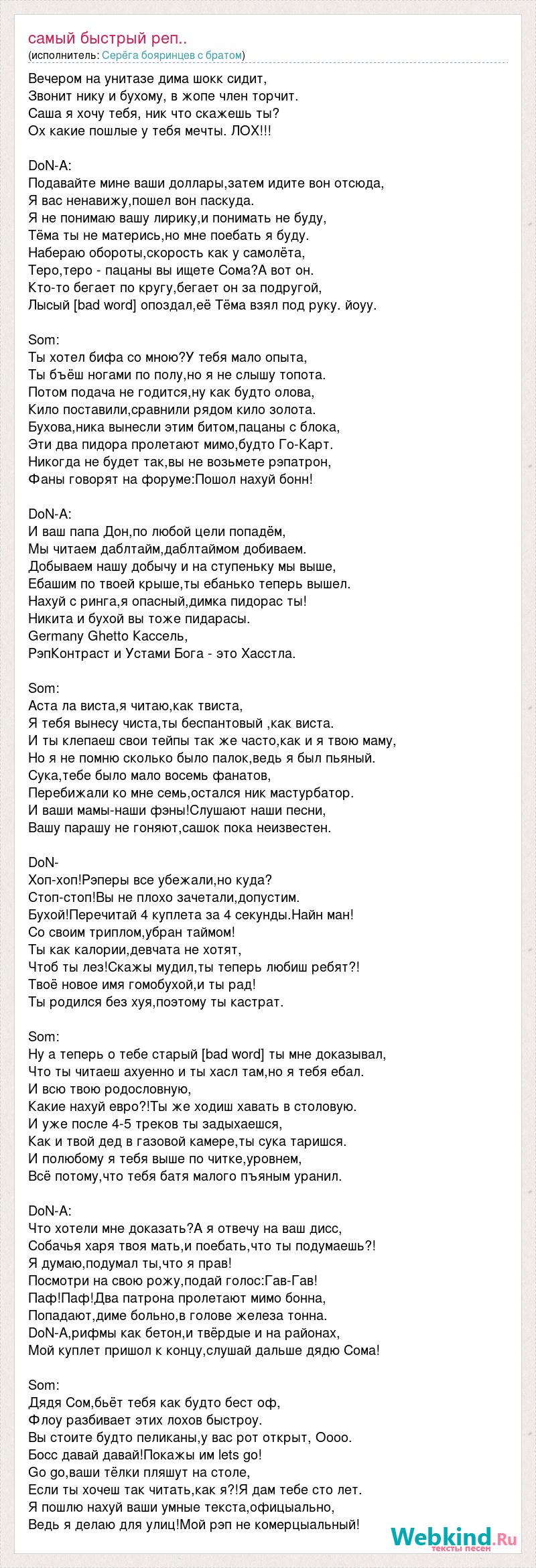 Вечером на унитазе дима шокк сидит, Звонит нику и бухому, в жопе член торчит. Саша я хочу тебя, ник что скажешь ты? Ох какие пошлые у тебя мечты. ЛОХ!!! DoN-A: Подавайте мине ваши доллары,затем идите вон отсюда, Я вас ненавижу,пошел вон паскуда. Я не понимаю вашу лирику,и понимать не буду, Тёма ты не матерись,но мне поебать я буду. Набераю обороты,скорость как у самолёта, Теро,теро - пацаны вы ищете Сома?А вот он. Кто-то бегает по кругу,бегает он за подругой, Лысый [bad word] опоздал,её Тёма взял под руку. йоуу. Som: Ты хотел бифа со мною?У тебя мало опыта, Ты бъёш ногами по полу,но я не слышу топота. Потом подача не годится,ну как будто олова, Кило поставили,сравнили рядом кило золота. Бухова,ника вынесли этим битом,пацаны с блока, Эти два пидора пролетают мимо,будто Го-Карт. Никогда не будет так,вы не возьмете рэпатрон, Фаны говорят на форуме:Пошол нахуй бонн! DoN-A: И ваш папа Дон,по любой цели попадём, Мы читаем даблтайм,даблтаймом добиваем. Добываем нашу добычу и на ступеньку мы выше, Ебашим по твоей крыше,ты ебанько теперь вышел. Нахуй с ринга,я опасный,димка пидорас ты! Никита и бухой вы тоже пидарасы. Germany Ghetto Кассель, РэпКонтраст и Устами Бога - это Хасстла. Som: Аста ла виста,я читаю,как твиста, Я тебя вынесу чиста,ты беспантовый ,как виста. И ты клепаеш свои тейпы так же часто,как и я твою маму, Но я не помню сколько было палок,ведь я был пьяный. Сука,тебе было мало восемь фанатов, Перебижали ко мне семь,остался ник мастурбатор. И ваши мамы-наши фэны!Слушают наши песни, Вашу парашу не гоняют,сашок пока неизвестен. DoN- Хоп-хоп!Рэперы все убежали,но куда? Стоп-стоп!Вы не плохо зачетали,допустим. Бухой!Перечитай 4 куплета за 4 секунды.Найн ман! Со своим триплом,убран таймом! Ты как калории,девчата не хотят, Чтоб ты лез!Скажы мудил,ты теперь любиш ребят?! Твоё новое имя гомобухой,и ты рад! Ты родился без хуя,поэтому ты кастрат. Som: Ну а теперь о тебе старый [bad word] ты мне доказывал, Что ты читаеш ахуенно и ты хасл там,но я тебя ебал. И всю твою родословную, Какие нахуй евро?!Ты же ходиш хавать в столовую. И уже после 4-5 треков ты задыхаешся, Как и твой дед в газовой камере,ты сука таришся. И полюбому я тебя выше по читке,уровнем, Всё потому,что тебя батя малого пъяным уранил. DoN-A: Что хотели мне доказать?А я отвечу на ваш дисс, Собачья харя твоя мать,и поебать,что ты подумаешь?! Я думаю,подумал ты,что я прав! Посмотри на свою рожу,подай голос:Гав-Гав! Паф!Паф!Два патрона пролетают мимо бонна, Попадают,диме больно,в голове железа тонна. DoN-A,рифмы как бетон,и твёрдые и на районах, Мой куплет пришол к концу,слушай дальше дядю Сома! Som: Дядя Сом,бьёт тебя как будто бест оф, Флоу разбивает этих лохов быстроу. Вы стоите будто пеликаны,у вас рот открыт, Оооо. Босс давай давай!Покажы им lets go! Go go,ваши тёлки пляшут на столе, Если ты хочеш так читать,как я?!Я дам тебе сто лет. Я пошлю нахуй ваши умные текста,офицыально, Ведь я делаю для улиц!Мой рэп не комерцыальный!