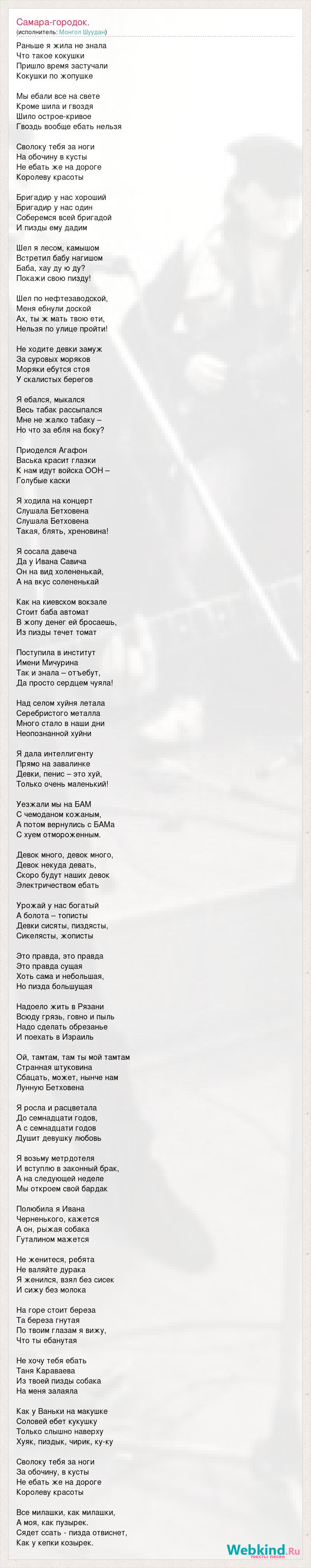 Раньше я жила не знала Что такое кокушки Пришло время застучали Кокушки по жопушке Мы ебали все на свете Кроме шила и гвоздя Шило острое-кривое Гвоздь вообще ебать нельзя Сволоку тебя за ноги На обочину в кусты Не ебать же на дороге Королеву красоты Бригадир у нас хороший Бригадир у нас один Соберемся всей бригадой И пизды ему дадим Шел я лесом, камышом Встретил бабу нагишом Баба, хау ду ю ду? Покажи свою пизду! Шел по нефтезаводской, Меня ебнули доской Ах, ты ж мать твою ети, Нельзя по улице пройти! Не ходите девки замуж За суровых моряков Моряки ебутся стоя У скалистых берегов Я ебался, мыкался Весь табак рассыпался Мне не жалко табаку – Но что за ебля на боку? Приоделся Агафон Васька красит глазки К нам идут войска ООН – Голубые каски Я ходила на концерт Слушала Бетховена Слушала Бетховена Такая, блять, хреновина! Я сосала давеча Да у Ивана Савича Он на вид холененькай, А на вкус солененькай Как на киевском вокзале Стоит баба автомат В жопу денег ей бросаешь, Из пизды течет томат Поступила в институт Имени Мичурина Так и знала – отъебут, Да просто сердцем чуяла! Над селом хуйня летала Серебристого металла Много стало в наши дни Неопознанной хуйни Я дала интеллигенту Прямо на завалинке Девки, пенис – это хуй, Только очень маленький! Уезжали мы на БАМ С чемоданом кожаным, А потом вернулись с БАМа С хуем отмороженным. Девок много, девок много, Девок некуда девать, Скоро будут наших девок Электричеством ебать Урожай у нас богатый А болота – тописты Девки сисяты, пиздясты, Сикелясты, жописты Это правда, это правда Это правда сущая Хоть сама и небольшая, Но пизда большущая Надоело жить в Рязани Всюду грязь, говно и пыль Надо сделать обрезанье И поехать в Израиль Ой, тамтам, там ты мой тамтам Странная штуковина Сбацать, может, нынче нам Лунную Бетховена Я росла и расцветала До семнадцати годов, А с семнадцати годов Душит девушку любовь Я возьму метрдотеля И вступлю в законный брак, А на следующей неделе Мы откроем свой бардак Полюбила я Ивана Черненького, кажется А он, рыжая собака Гуталином мажется Не женитеся, ребята Не валяйте дурака Я женился, взял без сисек И сижу без молока На горе стоит береза Та береза гнутая По твоим глазам я вижу, Что ты ебанутая Не хочу тебя ебать Таня Караваева Из твоей пизды собака На меня залаяла Как у Ваньки на макушке Соловей ебет кукушку Только слышно наверху Хуяк, пиздык, чирик, ку-ку Сволоку тебя за ноги За обочину, в кусты Не ебать же на дороге Королеву красоты Все милашки, как милашки, А моя, как пузырек. Сядет ссать - пизда отвиснет, Как у кепки козырек.