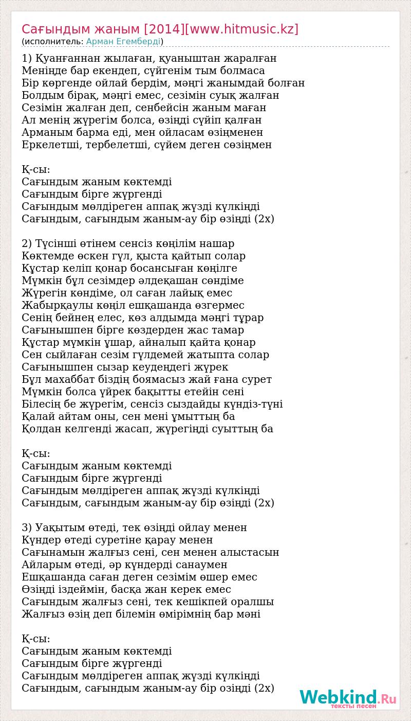 1) Қуанғаннан жылаған, қуаныштан жаралған Меніңде бар екендеп, сүйгенім тым болмаса Бір көргенде ойлай бердім, мәңгі жанымдай болған Болдым бірақ, мәңгі емес, сезімін суық жалған Сезімін жалған деп, сенбейсін жаным маған Ал менің жүрегім болса, өзіңді сүйіп қалған Арманым барма еді, мен ойласам өзіңменен Еркелетші, тербелетші, сүйем деген сөзіңмен Қ-сы: Сағындым жаным көктемді Сағындым бірге жүргенді Сағындым мөлдіреген аппақ жүзді күлкіңді Сағындым, сағындым жаным-ау бір өзіңді (2x) 2) Түсінші өтінем сенсіз көңілім нашар Көктемде өскен гүл, қыста қайтып солар Кұстар келіп қонар босансыған көңілге Мүмкін бұл сезімдер әлдеқашан сөндіме Жүрегін көндіме, ол саған лайық емес Жабырқаулы көңіл ешқашанда өзгермес Сенің бейнең елес, көз алдымда мәңгі тұрар Сағынышпен бірге көздерден жас тамар Құстар мүмкін ұшар, айналып қайта қонар Сен сыйлаған сезім гүлдемей жатыпта солар Сағынышпен сызар кеудеңдегі жүрек Бұл махаббат біздің боямасыз жай ғана сурет Мүмкін болса үйрек бақытты етейін сені Білесің бе жүрегім, сенсіз сыздайды күндіз-түні Қалай айтам оны, сен мені ұмыттың ба Қолдан келгенді жасап, жүрегіңді суыттың ба Қ-сы: Сағындым жаным көктемді Сағындым бірге жүргенді Сағындым мөлдіреген аппақ жүзді күлкіңді Сағындым, сағындым жаным-ау бір өзіңді (2x) 3) Уақытым өтеді, тек өзіңді ойлау менен Күндер өтеді суретіне қарау менен Сағынамын жалғыз сені, сен менен алыстасын Айларым өтеді, әр күндерді санаумен Ешқашанда саған деген сезімім өшер емес Өзіңді іздеймін, басқа жан керек емес Сағындым жалғыз сені, тек кешікпей оралшы Жалғыз өзің деп білемін өмірімнің бар мәні Қ-сы: Сағындым жаным көктемді Сағындым бірге жүргенді Сағындым мөлдіреген аппақ жүзді күлкіңді Сағындым, сағындым жаным-ау бір озіңді (2x)