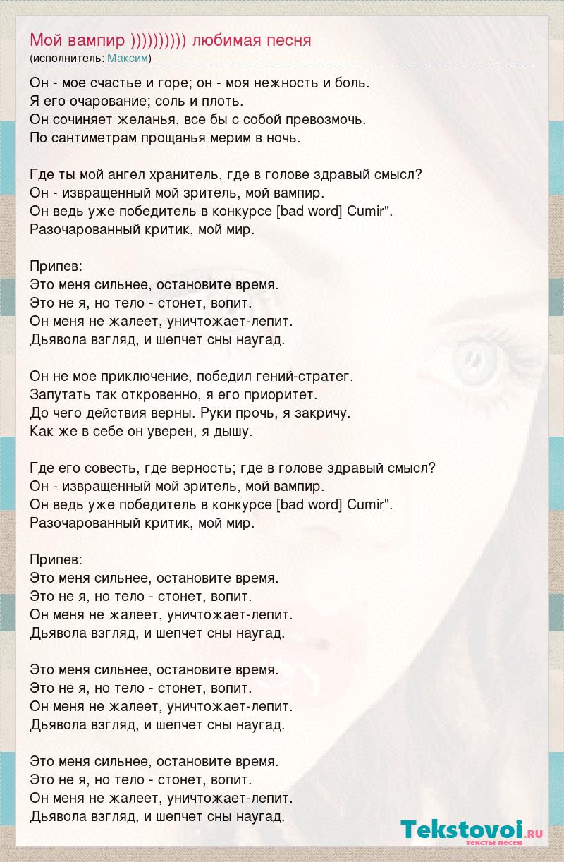 Он - мое счастье и горе; он - моя нежность и боль. Я его очарование; соль и плоть. Он сочиняет желанья, все бы с собой превозмочь. По сантиметрам прощанья мерим в ночь. Где ты мой ангел хранитель, где в голове здравый смысл? Он - извращенный мой зритель, мой вампир. Он ведь уже победитель в конкурсе "Russian Cumir". Разочарованный критик, мой мир. Припев: Это меня сильнее, остановите время. Это не я, но тело - стонет, вопит. Он меня не жалеет, уничтожает-лепит. Дьявола взгляд, и шепчет сны наугад. Он не мое приключение, победил гений-стратег. Запутать так откровенно, я его приоритет. До чего действия верны. Руки прочь, я закричу. Как же в себе он уверен, я дышу. Где его совесть, где верность; где в голове здравый смысл? Он - извращенный мой зритель, мой вампир. Он ведь уже победитель в конкурсе "Russian Cumir". Разочарованный критик, мой мир. Припев: Это меня сильнее, остановите время. Это не я, но тело - стонет, вопит. Он меня не жалеет, уничтожает-лепит. Дьявола взгляд, и шепчет сны наугад. Это меня сильнее, остановите время. Это не я, но тело - стонет, вопит. Он меня не жалеет, уничтожает-лепит. Дьявола взгляд, и шепчет сны наугад. Это меня сильнее, остановите время. Это не я, но тело - стонет, вопит. Он меня не жалеет, уничтожает-лепит. Дьявола взгляд, и шепчет сны наугад.