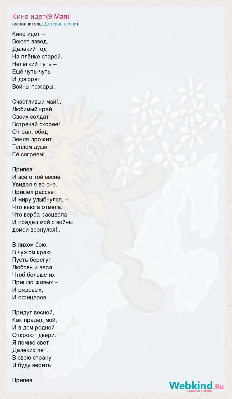 Кино идет – Воюет взвод. Далёкий год На плёнке старой. Нелёгкий путь – Ещё чуть-чуть И догорят Войны пожары. Счастливый май!.. Любимый край, Своих солдат Встречай скорее! От ран, обид Земля дрожит. Теплом души Её согреем! Припев: И всё о той весне Увидел я во сне. Пришёл рассвет И миру улыбнулся, – Что вьюга отмела, Что верба расцвела И прадед мой с войны домой вернулся!.. В лихом бою, В чужом краю Пусть берегут Любовь и вера, Чтоб больше их Пришло живых – И рядовых, И офицеров. Придут весной, Как прадед мой, И в дом родной Откроют двери. Я помню свет Далёких лет. В свою страну Я буду верить! Припев.