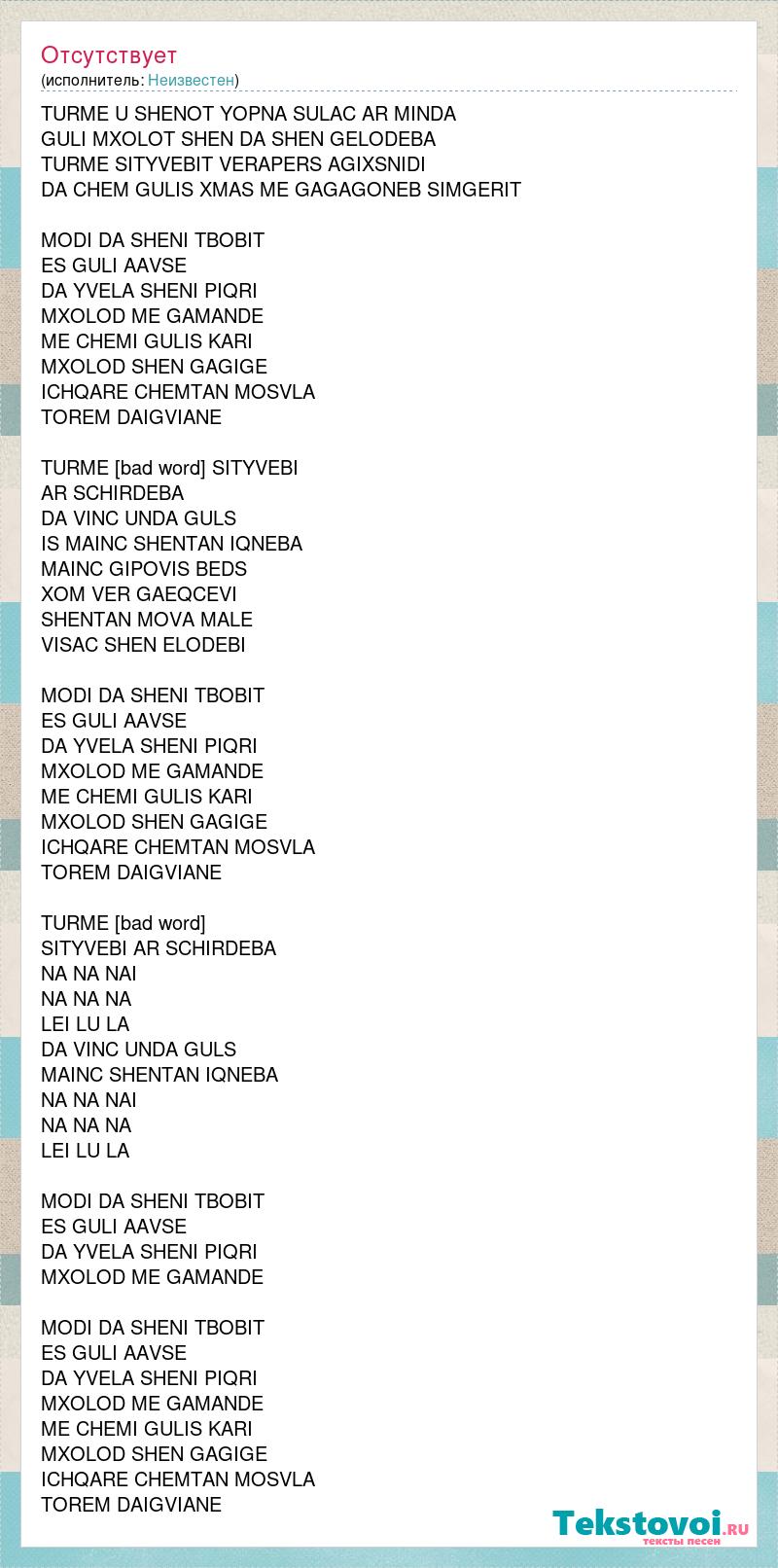 TURME U SHENOT YOPNA SULAC AR MINDA GULI MXOLOT SHEN DA SHEN GELODEBA TURME SITYVEBIT VERAPERS AGIXSNIDI DA CHEM GULIS XMAS ME GAGAGONEB SIMGERIT MODI DA SHENI TBOBIT ES GULI AAVSE DA YVELA SHENI PIQRI MXOLOD ME GAMANDE ME CHEMI GULIS KARI MXOLOD SHEN GAGIGE ICHQARE CHEMTAN MOSVLA TOREM DAIGVIANE TURME SIYVARULS SITYVEBI AR SCHIRDEBA DA VINC UNDA GULS IS MAINC SHENTAN IQNEBA MAINC GIPOVIS BEDS XOM VER GAEQCEVI SHENTAN MOVA MALE VISAC SHEN ELODEBI MODI DA SHENI TBOBIT ES GULI AAVSE DA YVELA SHENI PIQRI MXOLOD ME GAMANDE ME CHEMI GULIS KARI MXOLOD SHEN GAGIGE ICHQARE CHEMTAN MOSVLA TOREM DAIGVIANE TURME SIYVARULS SITYVEBI AR SCHIRDEBA NA NA NAI NA NA NA LEI LU LA DA VINC UNDA GULS MAINC SHENTAN IQNEBA NA NA NAI NA NA NA LEI LU LA MODI DA SHENI TBOBIT ES GULI AAVSE DA YVELA SHENI PIQRI MXOLOD ME GAMANDE MODI DA SHENI TBOBIT ES GULI AAVSE DA YVELA SHENI PIQRI MXOLOD ME GAMANDE ME CHEMI GULIS KARI MXOLOD SHEN GAGIGE ICHQARE CHEMTAN MOSVLA TOREM DAIGVIANE
