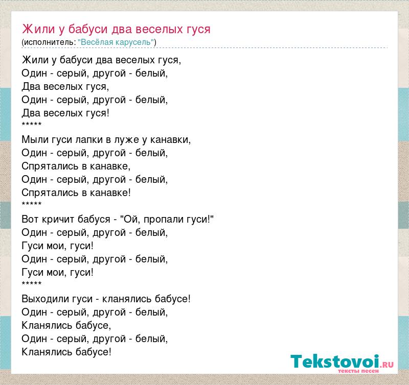 Жили у бабуси два веселых гуся, Один - серый, другой - белый, Два веселых гуся, Один - серый, другой - белый, Два веселых гуся! ***** Мыли гуси лапки в луже у канавки, Один - серый, другой - белый, Спрятались в канавке, Один - серый, другой - белый, Спрятались в канавке! ***** Вот кричит бабуся - "Ой, пропали гуси!" Один - серый, другой - белый, Гуси мои, гуси! Один - серый, другой - белый, Гуси мои, гуси! ***** Выходили гуси - кланялись бабусе! Один - серый, другой - белый, Кланялись бабусе, Один - серый, другой - белый, Кланялись бабусе!