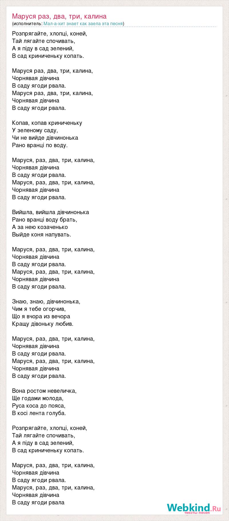 Розпрягайте, хлопцi, коней, Тай лягайте спочивать, А я пiду в сад зелений, В сад криниченьку копать. Маруся раз, два, три, калина, Чорнявая дiвчина В саду ягоди рвала. Маруся раз, два, три, калина, Чорнявая дiвчина В саду ягоди рвала. Копав, копав криниченьку У зеленому саду, Чи не вийде дiвчинонька Рано вранцi по воду. Маруся, раз, два, три, калина, Чорнявая дiвчина В саду ягоди рвала. Маруся, раз, два, три, калина, Чорнявая дiвчина В саду ягоди рвала. Вийшла, вийшла дiвчинонька Рано вранцi воду брать, А за нею козаченько Выйде коня напувать. Маруся, раз, два, три, калина, Чорнявая дiвчина В саду ягоди рвала. Маруся, раз, два, три, калина, Чорнявая дiвчина В саду ягоди рвала. Знаю, знаю, дiвчинонька, Чим я тебе огорчив, Що я вчора из вечора Кращу дiвоньку любив. Маруся, раз, два, три, калина, Чорнявая дiвчина В саду ягоди рвала. Маруся, раз, два, три, калина, Чорнявая дiвчина В саду ягоди рвала. Вона ростом невеличка, Ще годами молода, Руса коса до пояса, В косi лента голуба. Розпрягайте, хлопцi, коней, Тай лягайте спочивать, А я пiду в сад зелений, В сад криниченьку копать. Маруся, раз, два, три, калина, Чорнявая дiвчина В саду ягоди рвала. Маруся, раз, два, три, калина, Чорнявая дiвчина В саду ягоди рвала