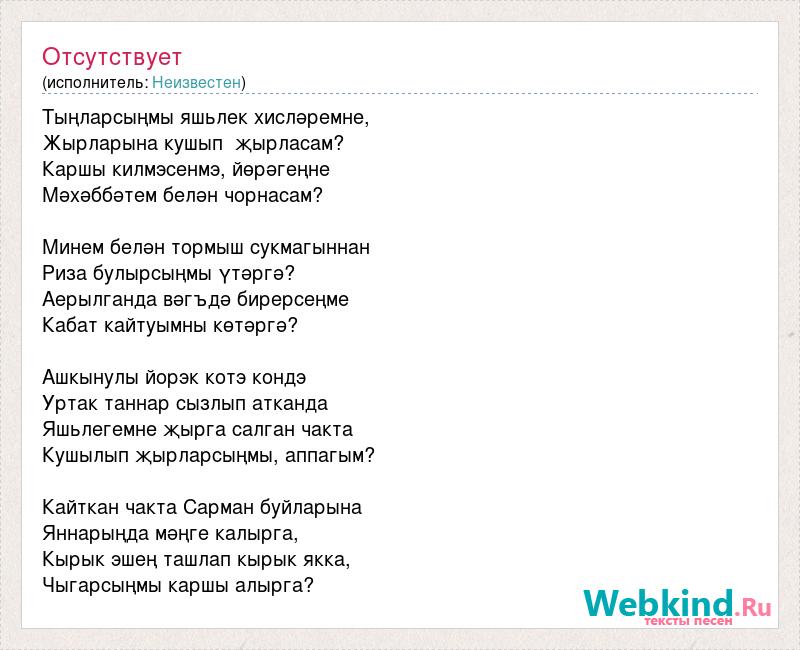 Тыңларсыңмы яшьлек хисләремне, Жырларына кушып җырласам? Каршы килмэсенмэ, йөрәгеңне Мәхәббәтем белән чорнасам? Минем белән тормыш сукмагыннан Риза булырсыңмы үтәргә? Аерылганда вәгъдә бирерсеңме Кабат кайтуымны көтәргә? Ашкынулы йорэк котэ кондэ Уртак таннар сызлып атканда Яшьлегемне җырга салган чакта Кушылып җырларсыңмы, аппагым? Кайткан чакта Сарман буйларына Яннарыңда мәңге калырга, Кырык эшең ташлап кырык якка, Чыгарсыңмы каршы алырга?