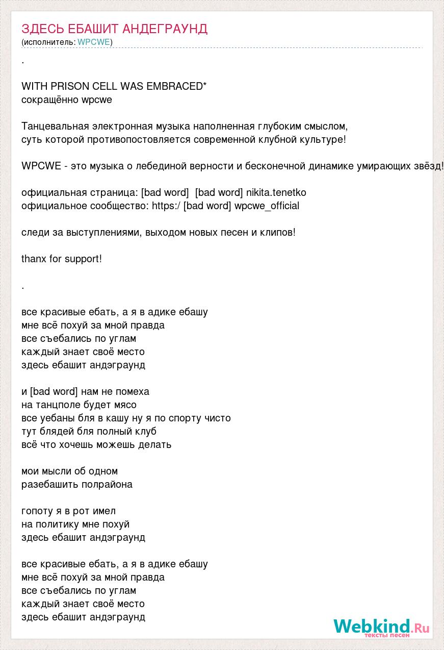 . WITH PRISON CELL WAS EMBRACED* сокращённо wpcwe Танцевальная электронная музыка наполненная глубоким смыслом, суть которой противопостовляется современной клубной культуре! WPCWE - это музыка о лебединой верности и бесконечной динамике умирающих звёзд! официальная страница: [bad word] [bad word] nikita.tenetko официальное сообщество: https:/ [bad word] wpcwe_official следи за выступлениями, выходом новых песен и клипов! thanx for support! . все красивые ебать, а я в адике ебашу мне всё похуй за мной правда все съебались по углам каждый знает своё место здесь ебашит андэграунд и [bad word] нам не помеха на танцполе будет мясо все уебаны бля в кашу ну я по спорту чисто тут блядей бля полный клуб всё что хочешь можешь делать мои мысли об одном разебашить полрайона гопоту я в рот имел на политику мне похуй здесь ебашит андэграунд все красивые ебать, а я в адике ебашу мне всё похуй за мной правда все съебались по углам каждый знает своё место здесь ебашит андэграунд