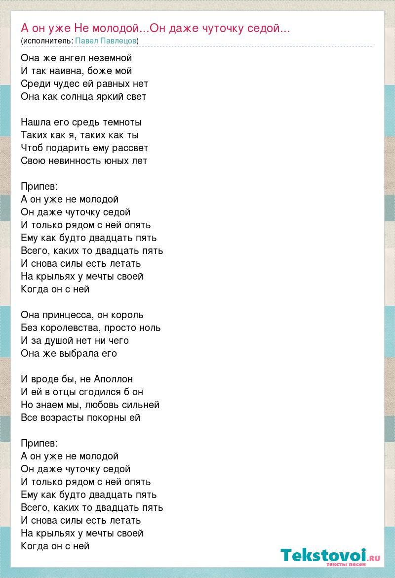 Она же ангел неземной И так наивна, боже мой Среди чудес ей равных нет Она как солнца яркий свет Нашла его средь темноты Таких как я, таких как ты Чтоб подарить ему рассвет Свою невинность юных лет Припев: А он уже не молодой Он даже чуточку седой И только рядом с ней опять Ему как будто двадцать пять Всего, каких то двадцать пять И снова силы есть летать На крыльях у мечты своей Когда он с ней Она принцесса, он король Без королевства, просто ноль И за душой нет ни чего Она же выбрала его И вроде бы, не Аполлон И ей в отцы сгодился б он Но знаем мы, любовь сильней Все возрасты покорны ей Припев: А он уже не молодой Он даже чуточку седой И только рядом с ней опять Ему как будто двадцать пять Всего, каких то двадцать пять И снова силы есть летать На крыльях у мечты своей Когда он с ней