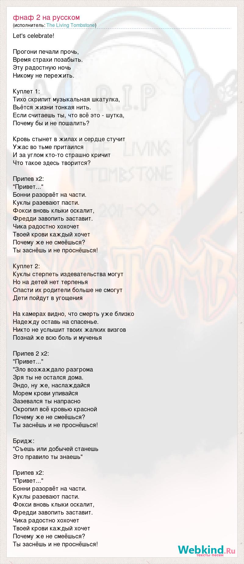Let's celebrate! Прогони печали прочь, Время страхи позабыть. Эту радостную ночь Никому не пережить. Куплет 1: Тихо скрипит музыкальная шкатулка, Вьётся жизни тонкая нить. Если считаешь ты, что всё это - шутка, Почему бы и не пошалить? Кровь стынет в жилах и сердце стучит Ужас во тьме притаился И за углом кто-то страшно кричит Что такое здесь творится? Припев x2: "Привет..." Бонни разорвёт на части. Куклы разевают пасти. Фокси вновь клыки оскалит, Фредди завопить заставит. Чика радостно хохочет Твоей крови каждый хочет Почему же не смеёшься? Ты заснёшь и не проснёшься! Куплет 2: Куклы стерпеть издевательства могут Но на детей нет терпенья Спасти их родители больше не смогут Дети пойдут в угощения На камерах видно, что смерть уже близко Надежду оставь на спасенье. Никто не услышит твоих жалких визгов Познай же всю боль и мученья Припев 2 x2: "Привет..." "Зло возжаждало разгрома Зря ты не остался дома. Эндо, ну же, наслаждайся Морем крови упивайся Зазевался ты напрасно Окропил всё кровью красной Почему же не смеёшься? Ты заснёшь и не проснёшься! Бридж: "Съешь или добычей станешь Это правило ты знаешь" Припев x2: "Привет..." Бонни разорвёт на части. Куклы разевают пасти. Фокси вновь клыки оскалит, Фредди завопить заставит. Чика радостно хохочет Твоей крови каждый хочет Почему же не смеёшься? Ты заснёшь и не проснёшься!