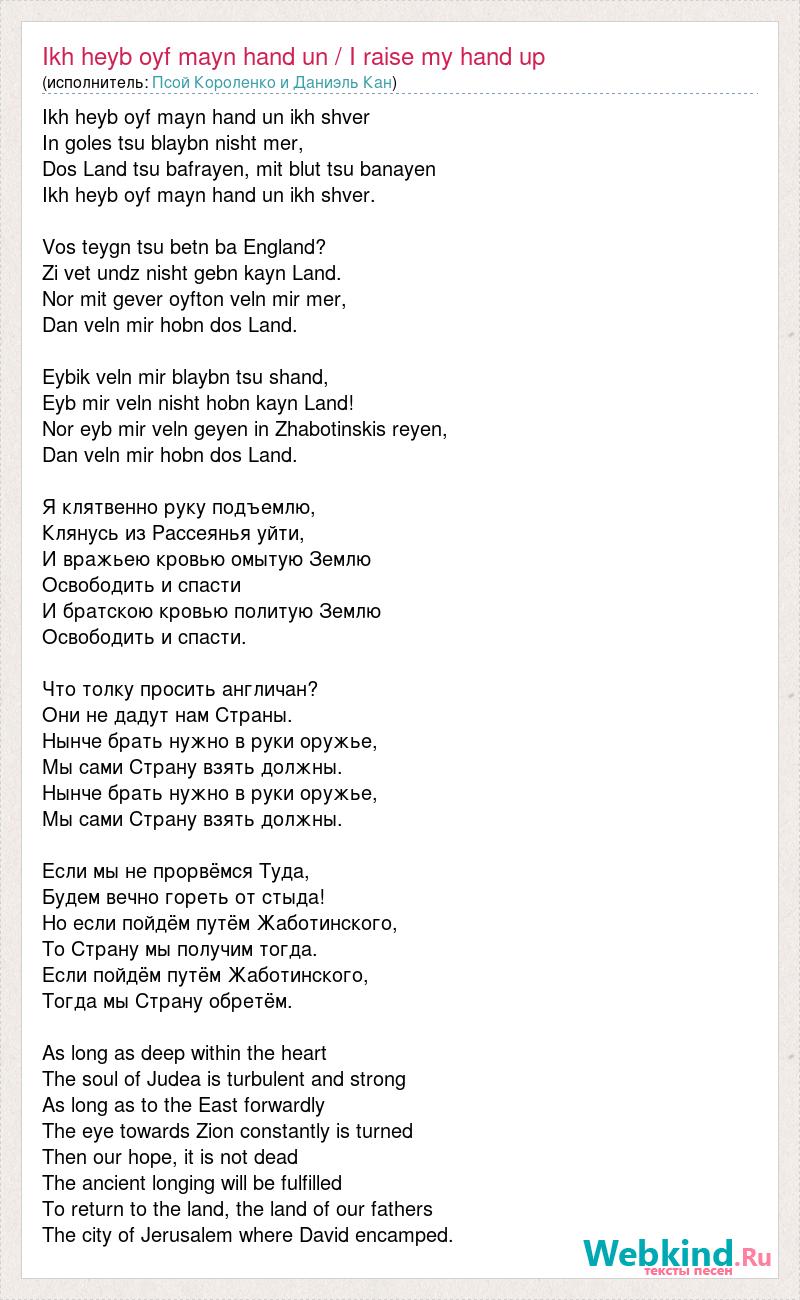 Ikh heyb oyf mayn hand un ikh shver In goles tsu blaybn nisht mer, Dos Land tsu bafrayen, mit blut tsu banayen Ikh heyb oyf mayn hand un ikh shver. Vos teygn tsu betn ba England? Zi vet undz nisht gebn kayn Land. Nor mit gever oyfton veln mir mer, Dan veln mir hobn dos Land. Eybik veln mir blaybn tsu shand, Eyb mir veln nisht hobn kayn Land! Nor eyb mir veln geyen in Zhabotinskis reyen, Dan veln mir hobn dos Land. Я клятвенно руку подъемлю, Клянусь из Рассеянья уйти, И вражьею кровью омытую Землю Освободить и спасти И братскою кровью политую Землю Освободить и спасти. Что толку просить англичан? Они не дадут нам Страны. Нынче брать нужно в руки оружье, Мы сами Страну взять должны. Нынче брать нужно в руки оружье, Мы сами Страну взять должны. Если мы не прорвёмся Туда, Будем вечно гореть от стыда! Но если пойдём путём Жаботинского, То Страну мы получим тогда. Если пойдём путём Жаботинского, Тогда мы Страну обретём. As long as deep within the heart The soul of Judea is turbulent and strong As long as to the East forwardly The eye towards Zion constantly is turned Then our hope, it is not dead The ancient longing will be fulfilled To return to the land, the land of our fathers The city of Jerusalem where David encamped.