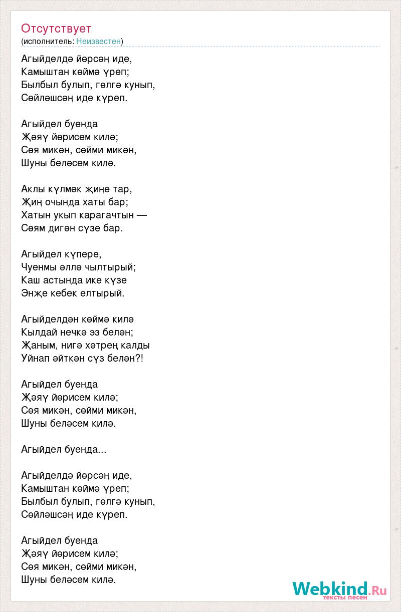 Агыйделдә йөрсәң иде, Камыштан көймә үреп; Былбыл булып, гөлгә кунып, Сөйләшсәң иде күреп. Агыйдел буенда Җәяү йөрисем килә; Сөя микән, сөйми микән, Шуны беләсем килә. Аклы күлмәк җиңе тар, Җиң очында хаты бар; Хатын укып карагачтын — Сөям дигән сүзе бар. Агыйдел күпере, Чуенмы әллә чылтырый; Каш астында ике күзе Энҗе кебек елтырый. Агыйделдән көймә килә Кылдай нечкә эз белән; Җаным, нигә хәтрең калды Уйнап әйткән сүз белән?! Агыйдел буенда Җәяү йөрисем килә; Сөя микән, сөйми микән, Шуны беләсем килә. Агыйдел буенда... Агыйделдә йөрсәң иде, Камыштан көймә үреп; Былбыл булып, гөлгә кунып, Сөйләшсәң иде күреп. Агыйдел буенда Җәяү йөрисем килә; Сөя микән, сөйми микән, Шуны беләсем килә.