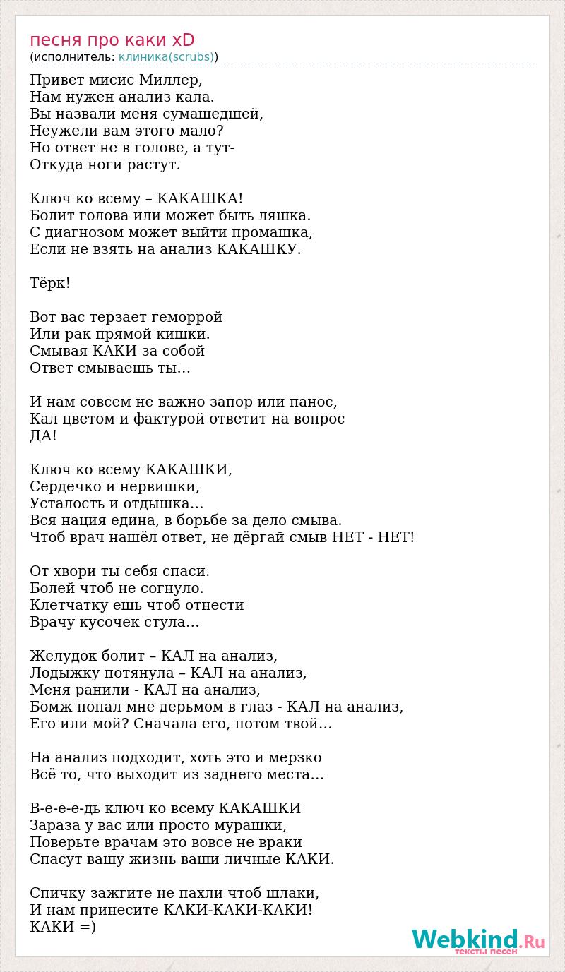 Привет мисис Миллер, Нам нужен анализ кала. Вы назвали меня сумашедшей, Неужели вам этого мало? Но ответ не в голове, а тут- Откуда ноги растут. Ключ ко всему – КАКАШКА! Болит голова или может быть ляшка. С диагнозом может выйти промашка, Если не взять на анализ КАКАШКУ. Тёрк! Вот вас терзает геморрой Или рак прямой кишки. Смывая КАКИ за собой Ответ смываешь ты… И нам совсем не важно запор или панос, Кал цветом и фактурой ответит на вопрос ДА! Ключ ко всему КАКАШКИ, Сердечко и нервишки, Усталость и отдышка… Вся нация едина, в борьбе за дело смыва. Чтоб врач нашёл ответ, не дёргай смыв НЕТ - НЕТ! От хвори ты себя спаси. Болей чтоб не согнуло. Клетчатку ешь чтоб отнести Врачу кусочек стула… Желудок болит – КАЛ на анализ, Лодыжку потянула – КАЛ на анализ, Меня ранили - КАЛ на анализ, Бомж попал мне дерьмом в глаз - КАЛ на анализ, Его или мой? Сначала его, потом твой… На анализ подходит, хоть это и мерзко Всё то, что выходит из заднего места… В-е-е-е-дь ключ ко всему КАКАШКИ Зараза у вас или просто мурашки, Поверьте врачам это вовсе не враки Спасут вашу жизнь ваши личные КАКИ. Спичку зажгите не пахли чтоб шлаки, И нам принесите КАКИ-КАКИ-КАКИ! КАКИ =)