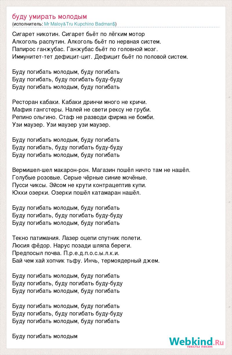 Сигарет никотин. Сигарет бьёт по лёгким мотор Алкоголь распутин. Алкоголь бьёт по нервная систем. Папирос ганжубас. Ганжубас бьёт по головной мозг. Иммунитет-тет дефицит-цит. Дефицит бьёт по половой систем. Буду погибать молодым, буду погибать Буду погибать, буду погибать буду-буду Буду погибать молодым, буду погибать Ресторан кабаки. Кабаки дринчи много не кричи. Мафия гангстеры. Налей не свети рексу не груби. Репино ольгино. Стаф не разводи фирма не бомби. Узи маузер. Узи маузер узи маузер. Буду погибать молодым, буду погибать Буду погибать, буду погибать буду-буду Буду погибать молодым, буду погибать Вермишел-шел макарон-рон. Магазин пошёл ничто там не нашёл. Голубые розовые. Серые чёрные синие мочёные. Пусси чиксы. Эйсом не крути контрацептив купи. Юкки озерки. Озерки пошёл катамаран нашёл. Буду погибать молодым, буду погибать Буду погибать, буду погибать буду-буду Буду погибать молодым, буду погибать Текно патимания. Лазер оцепи спутник полети. Люсия фёдор. Нарус позади шляпа береги. Предпосыл почва. П.р.е.д.п.о.с.ы.л.к.и. Бай чем хай хопчик тьфу. Инчь, термоядерный джем. Буду погибать молодым, буду погибать Буду погибать, буду погибать буду-буду Буду погибать молодым, буду погибать Буду погибать молодым, буду погибать Буду погибать, буду погибать буду-буду Буду погибать молодым, буду погибать Буду погибать молодым