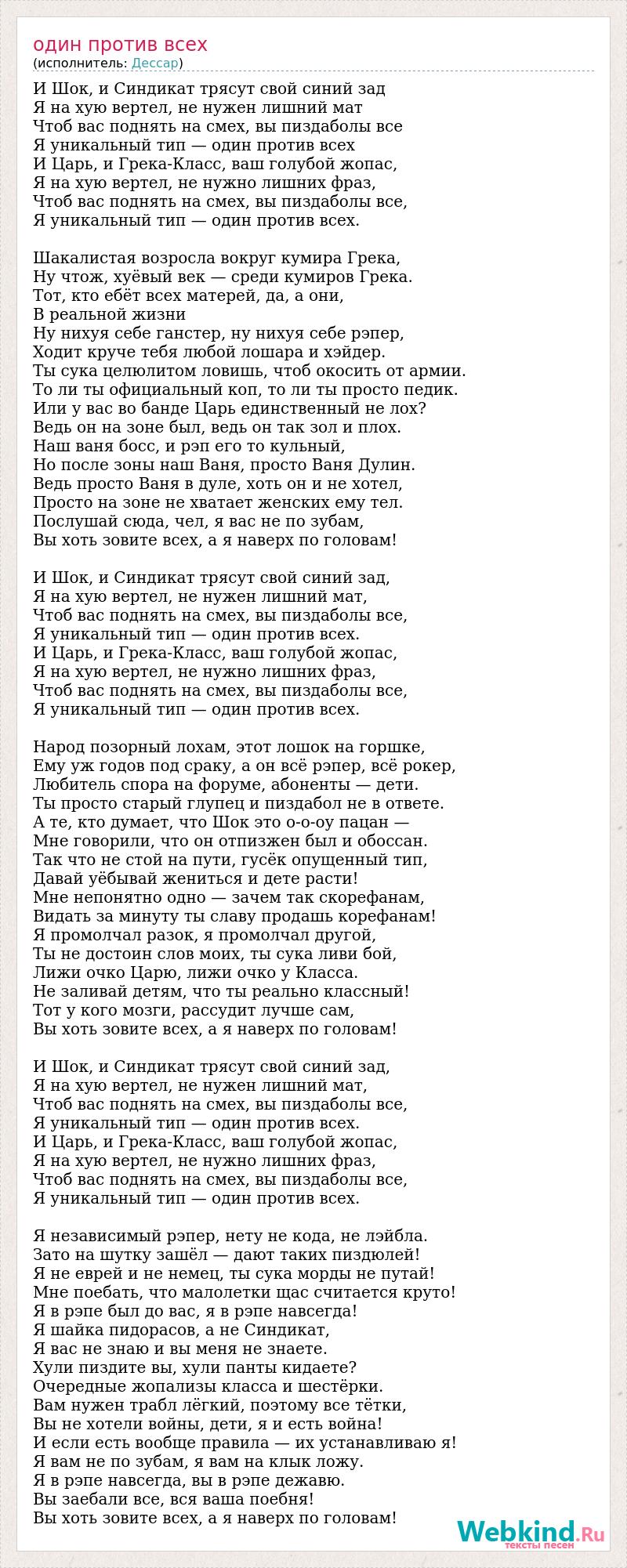 И Шок, и Синдикат трясут свой синий зад Я на хую вертел, не нужен лишний мат Чтоб вас поднять на смех, вы пиздаболы все Я уникальный тип — один против всех И Царь, и Грека-Класс, ваш голубой жопас, Я на хую вертел, не нужно лишних фраз, Чтоб вас поднять на смех, вы пиздаболы все, Я уникальный тип — один против всех. Шакалистая возросла вокруг кумира Грека, Ну чтож, хуёвый век — среди кумиров Грека. Тот, кто ебёт всех матерей, да, а они, В реальной жизни Ну нихуя себе ганстер, ну нихуя себе рэпер, Ходит круче тебя любой лошара и хэйдер. Ты сука целюлитом ловишь, чтоб окосить от армии. То ли ты официальный коп, то ли ты просто педик. Или у вас во банде Царь единственный не лох? Ведь он на зоне был, ведь он так зол и плох. Наш ваня босс, и рэп его то кульный, Но после зоны наш Ваня, просто Ваня Дулин. Ведь просто Ваня в дуле, хоть он и не хотел, Просто на зоне не хватает женских ему тел. Послушай сюда, чел, я вас не по зубам, Вы хоть зовите всех, а я наверх по головам! И Шок, и Синдикат трясут свой синий зад, Я на хую вертел, не нужен лишний мат, Чтоб вас поднять на смех, вы пиздаболы все, Я уникальный тип — один против всех. И Царь, и Грека-Класс, ваш голубой жопас, Я на хую вертел, не нужно лишних фраз, Чтоб вас поднять на смех, вы пиздаболы все, Я уникальный тип — один против всех. Народ позорный лохам, этот лошок на горшке, Ему уж годов под сраку, а он всё рэпер, всё рокер, Любитель спора на форуме, абоненты — дети. Ты просто старый глупец и пиздабол не в ответе. А те, кто думает, что Шок это о-о-оу пацан — Мне говорили, что он отпизжен был и обоссан. Так что не стой на пути, гусёк опущенный тип, Давай уёбывай жениться и дете расти! Мне непонятно одно — зачем так скорефанам, Видать за минуту ты славу продашь корефанам! Я промолчал разок, я промолчал другой, Ты не достоин слов моих, ты сука ливи бой, Лижи очко Царю, лижи очко у Класса. Не заливай детям, что ты реально классный! Тот у кого мозги, рассудит лучше сам, Вы хоть зовите всех, а я наверх по головам! И Шок, и Синдикат трясут свой синий зад, Я на хую вертел, не нужен лишний мат, Чтоб вас поднять на смех, вы пиздаболы все, Я уникальный тип — один против всех. И Царь, и Грека-Класс, ваш голубой жопас, Я на хую вертел, не нужно лишних фраз, Чтоб вас поднять на смех, вы пиздаболы все, Я уникальный тип — один против всех. Я независимый рэпер, нету не кода, не лэйбла. Зато на шутку зашёл — дают таких пиздюлей! Я не еврей и не немец, ты сука морды не путай! Мне поебать, что малолетки щас считается круто! Я в рэпе был до вас, я в рэпе навсегда! Я шайка пидорасов, а не Синдикат, Я вас не знаю и вы меня не знаете. Хули пиздите вы, хули панты кидаете? Очередные жопализы класса и шестёрки. Вам нужен трабл лёгкий, поэтому все тётки, Вы не хотели войны, дети, я и есть война! И если есть вообще правила — их устанавливаю я! Я вам не по зубам, я вам на клык ложу. Я в рэпе навсегда, вы в рэпе дежавю. Вы заебали все, вся ваша поебня! Вы хоть зовите всех, а я наверх по головам!