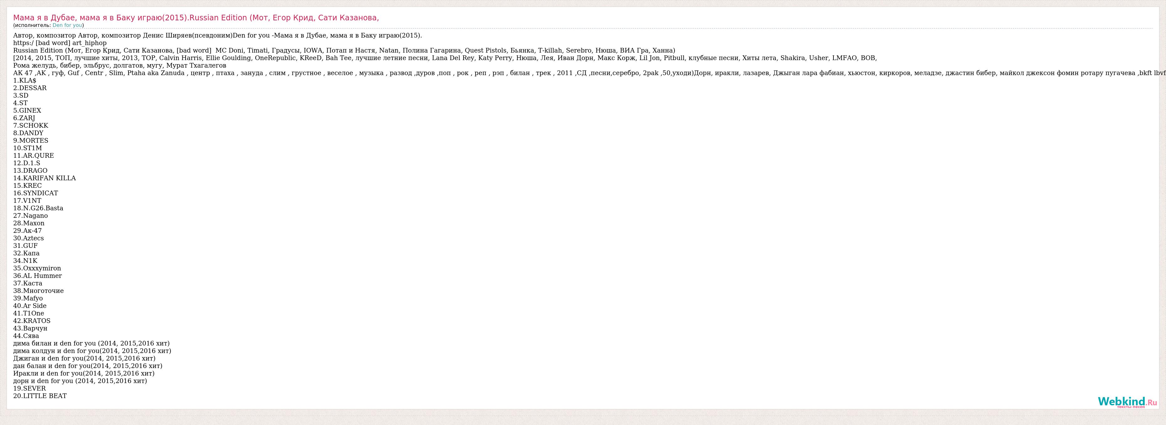 Главная→Исполнители→Den for you→Мама я в Дубае, мама я в Баку играю(2015).Russian Edition (Мот, Егор Крид,