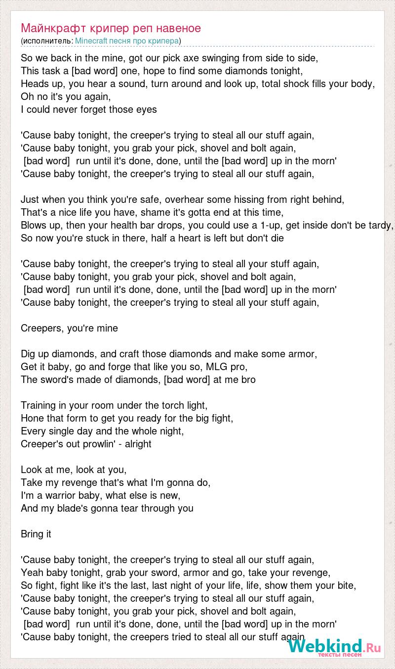 So we back in the mine, got our pick axe swinging from side to side, This task a [bad word] one, hope to find some diamonds tonight, Heads up, you hear a sound, turn around and look up, total shock fills your body, Oh no it's you again, I could never forget those eyes 'Cause baby tonight, the creeper's trying to steal all our stuff again, 'Cause baby tonight, you grab your pick, shovel and bolt again, [bad word] run until it's done, done, until the [bad word] up in the morn' 'Cause baby tonight, the creeper's trying to steal all our stuff again, Just when you think you're safe, overhear some hissing from right behind, That's a nice life you have, shame it's gotta end at this time, Blows up, then your health bar drops, you could use a 1-up, get inside don't be tardy, So now you're stuck in there, half a heart is left but don't die 'Cause baby tonight, the creeper's trying to steal all your stuff again, 'Cause baby tonight, you grab your pick, shovel and bolt again, [bad word] run until it's done, done, until the [bad word] up in the morn' 'Cause baby tonight, the creeper's trying to steal all your stuff again, Creepers, you're mine Dig up diamonds, and craft those diamonds and make some armor, Get it baby, go and forge that like you so, MLG pro, The sword's made of diamonds, [bad word] at me bro Training in your room under the torch light, Hone that form to get you ready for the big fight, Every single day and the whole night, Creeper's out prowlin' - alright Look at me, look at you, Take my revenge that's what I'm gonna do, I'm a warrior baby, what else is new, And my blade's gonna tear through you Bring it 'Cause baby tonight, the creeper's trying to steal all our stuff again, Yeah baby tonight, grab your sword, armor and go, take your revenge, So fight, fight like it's the last, last night of your life, life, show them your bite, 'Cause baby tonight, the creeper's trying to steal all our stuff again, 'Cause baby tonight, you grab your pick, shovel and bolt again, [bad word] run until it's done, done, until the [bad word] up in the morn' 'Cause baby tonight, the creepers tried to steal all our stuff again