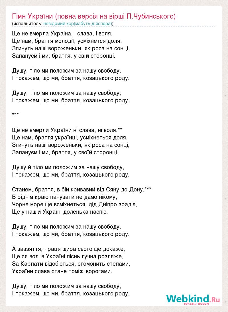 Ще не вмерла Украiна, і слава, і воля, Ще нам, браття молодії, усміхнется доля. Згинуть наші вороженьки, як роса на сонці, Запануєм і ми, браття, у свїй сторонці. Душу, тіло ми положим за нашу свободу, І покажем, що ми, браття, козацького роду. Душу, тіло ми положим за нашу свободу, І покажем, що ми, браття, козацького роду. *** Ще не вмерли України ні слава, ні воля.** Ще нам, браття українці, усміхнеться доля. Згинуть наші вороженьки, як роса на сонці, Запануєм і ми, браття, у своїй сторонці. Душу й тіло ми положим за нашу свободу, І покажем, що ми, браття, козацького роду. Станем, браття, в бій кривавий від Сяну до Дону,*** В ріднім краю панувати не дамо нікому; Чорне море ще всміхнеться, дід Дніпро зрадіє, Ще у нашій Україні доленька наспіє. Душу, тіло ми положим за нашу свободу, І покажем, що ми, браття, козацького роду. А завзяття, праця щира свого ще докаже, Ще ся волі в Україні піснь гучна розляже, За Карпати відоб'ється, згомонить степами, України слава стане поміж ворогами. Душу, тіло ми положим за нашу свободу, І покажем, що ми, браття, козацького роду.