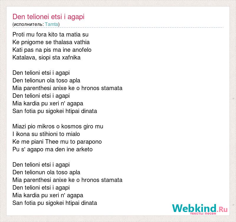 Proti mu fora kito ta matia su Ke pnigome se thalasa vathia Kati pas na pis ma ine anofelo Katalava, siopi sta xafnika Den telioni etsi i agapi Den telionun ola toso apla Mia parenthesi anixe ke o hronos stamata Den telioni etsi i agapi Mia kardia pu xeri n' agapa San fotia pu sigokei htipai dinata Miazi pio mikros o kosmos giro mu I ikona su stihioni to mialo Ke me piani Thee mu to parapono Pu s' agapo ma den ine arketo Den telioni etsi i agapi Den telionun ola toso apla Mia parenthesi anixe ke o hronos stamata Den telioni etsi i agapi Mia kardia pu xeri n' agapa San fotia pu sigokei htipai dinata