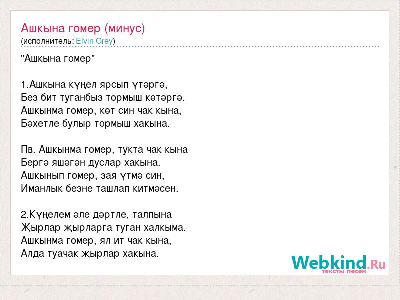 "Ашкына гомер" 1.Ашкына күңел ярсып үтәргә, Без бит туганбыз тормыш көтәргә. Ашкынма гомер, көт син чак кына, Бәхетле булыр тормыш хакына. Пв. Ашкынма гомер, тукта чак кына Бергә яшәгән дуслар хакына. Ашкынып гомер, зая үтмә син, Иманлык безне ташлап китмәсен. 2.Күңелем әле дәртле, талпына Җырлар җырларга туган халкыма. Ашкынма гомер, ял ит чак кына, Алда туачак җырлар хакына.