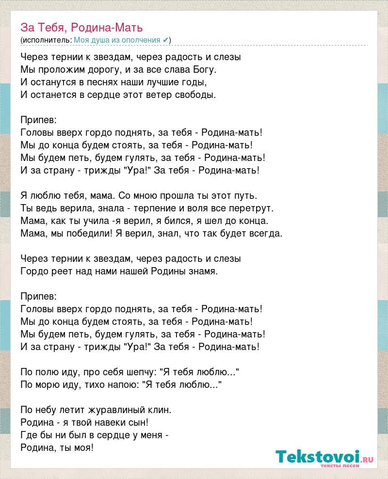 Через тернии к звездам, через радость и слезы Мы проложим дорогу, и за все слава Богу. И останутся в песнях наши лучшие годы, И останется в сердце этот ветер свободы. Припев: Головы вверх гордо поднять, за тебя - Родина-мать! Мы до конца будем стоять, за тебя - Родина-мать! Мы будем петь, будем гулять, за тебя - Родина-мать! И за страну - трижды "Ура!" За тебя - Родина-мать! Я люблю тебя, мама. Со мною прошла ты этот путь. Ты ведь верила, знала - терпение и воля все перетрут. Мама, как ты учила -я верил, я бился, я шел до конца. Мама, мы победили! Я верил, знал, что так будет всегда. Через тернии к звездам, через радость и слезы Гордо реет над нами нашей Родины знамя. Припев: Головы вверх гордо поднять, за тебя - Родина-мать! Мы до конца будем стоять, за тебя - Родина-мать! Мы будем петь, будем гулять, за тебя - Родина-мать! И за страну - трижды "Ура!" За тебя - Родина-мать! По полю иду, про себя шепчу: "Я тебя люблю..." По морю иду, тихо напою: "Я тебя люблю..." По небу летит журавлиный клин. Родина - я твой навеки сын! Где бы ни был в сердце у меня - Родина, ты моя!